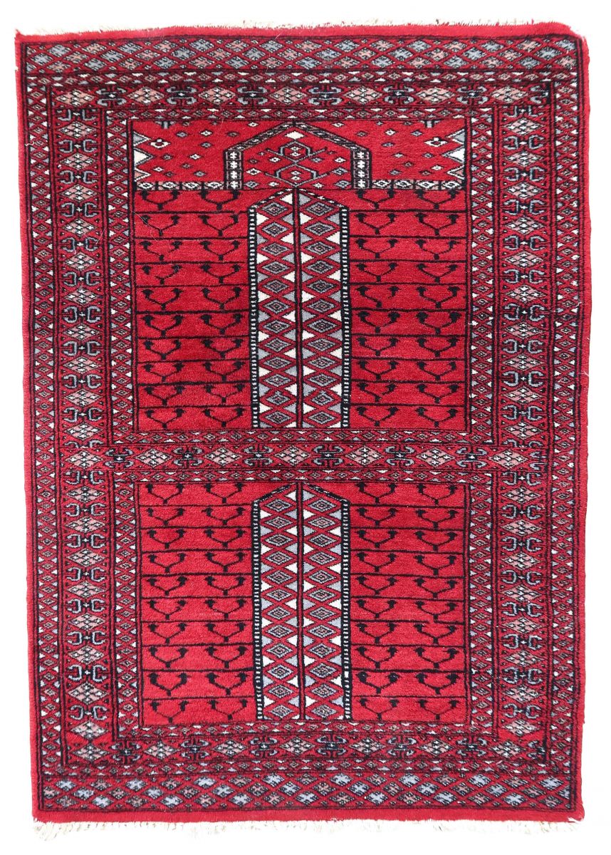 Handmade vintage red prayer rug from Pakistan in Lahore style. The rug is in original good condition, it is from the end of 20th century.