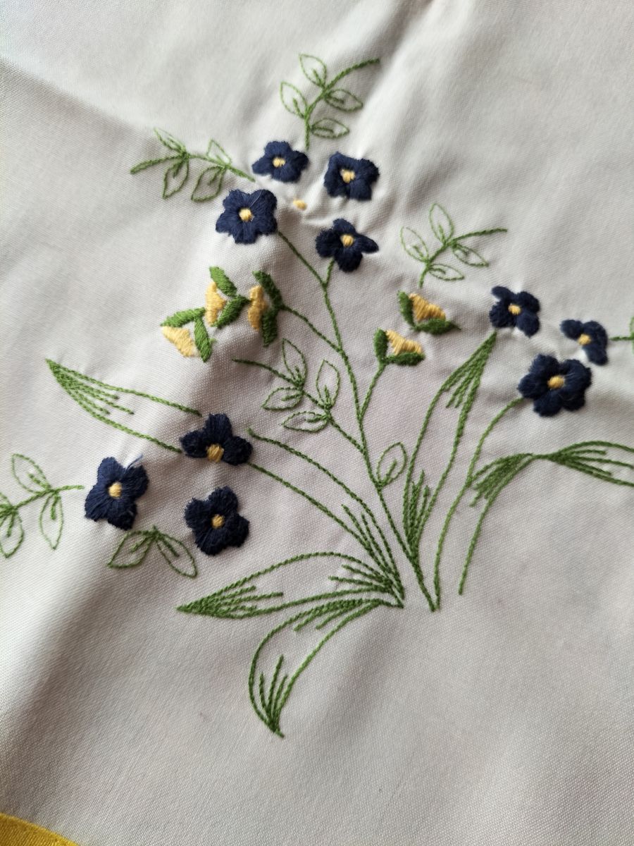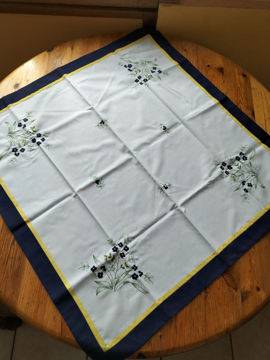 Napperon carre confectionné dans les années 70 - motif floral - liseret bleu et jaune - très bon état