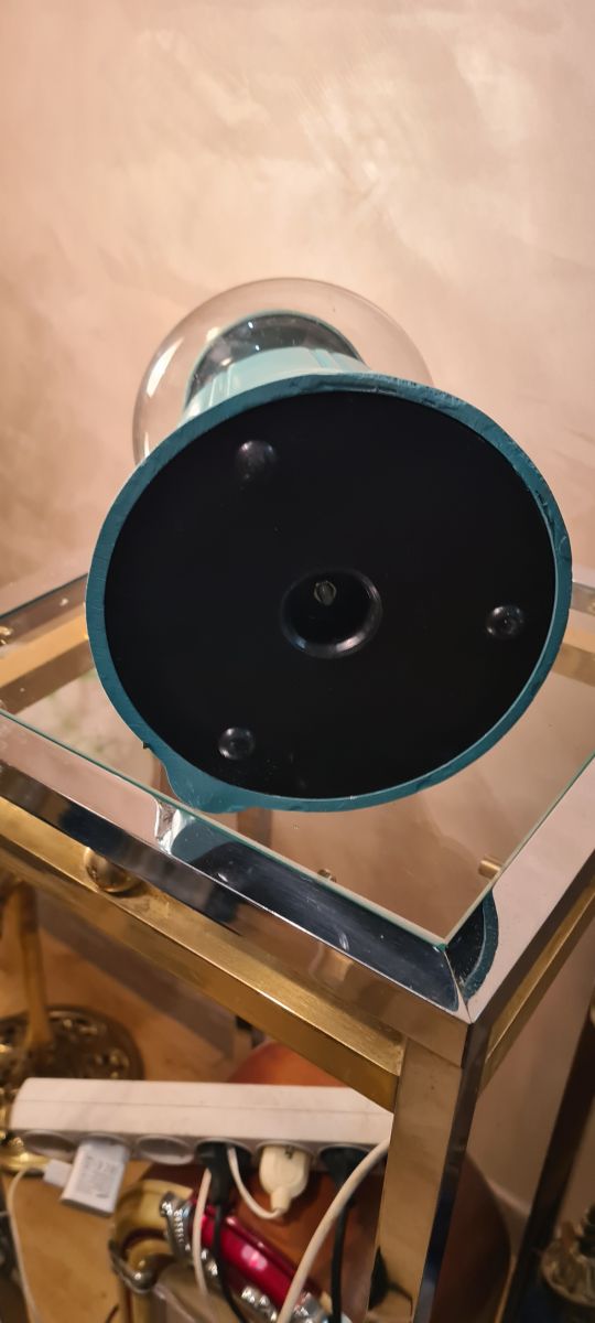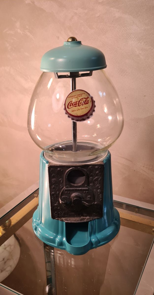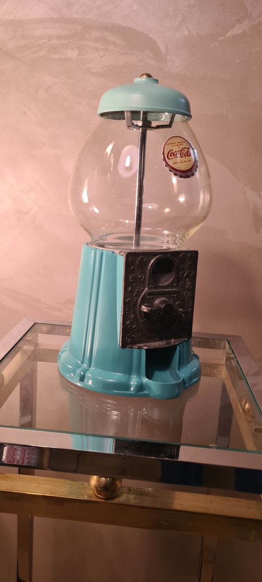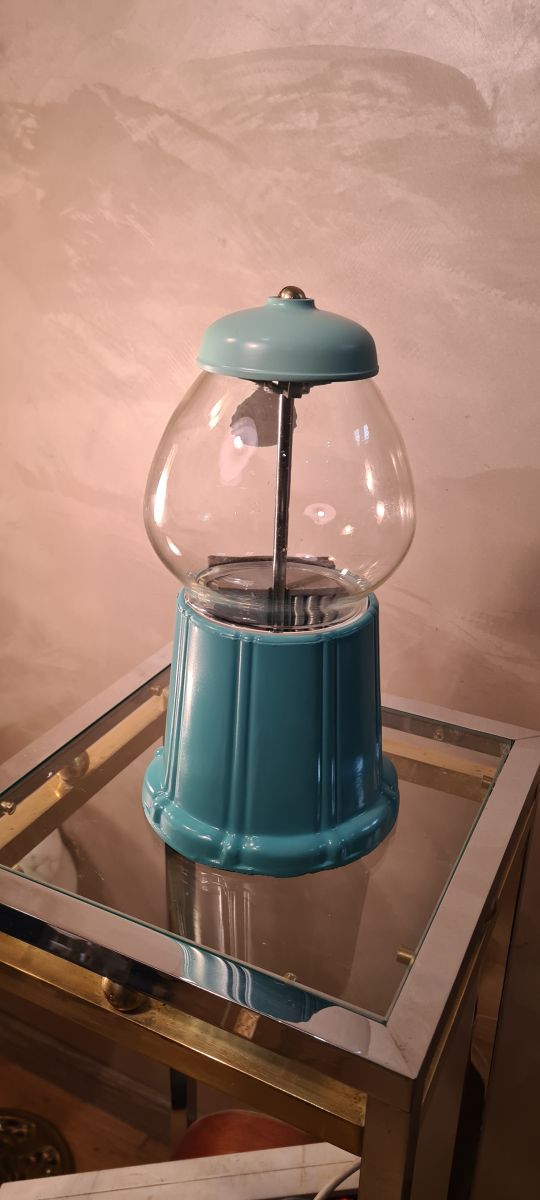 Distributeur de bonbon, chewing gum, cacahuète verre et metal couleur 2 tons de turquoise 30x16