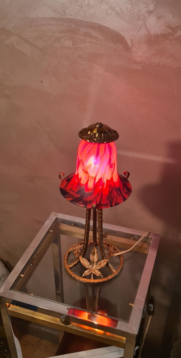 lampe fer forgé patiné or avec belle tulipe marbré orange , rouge ,noir ,tres belle 35x15 art deco