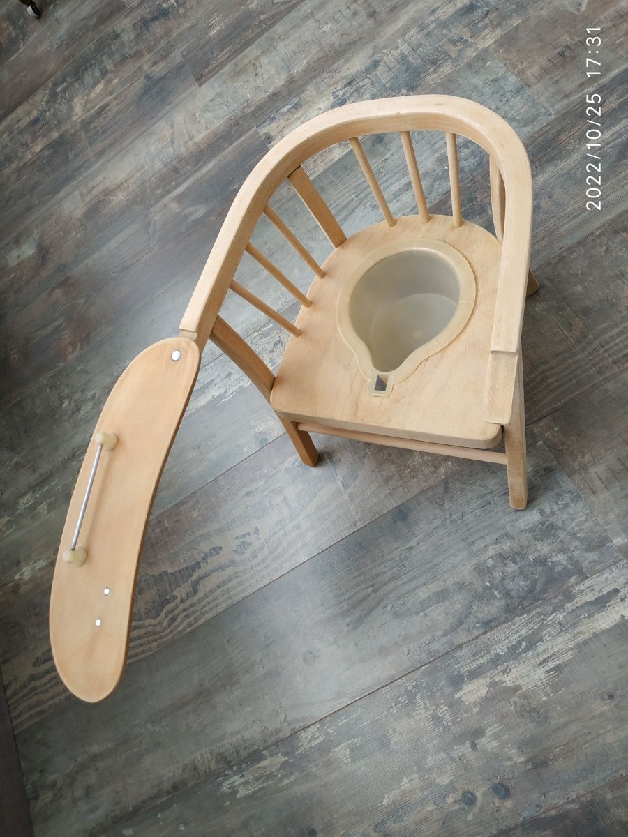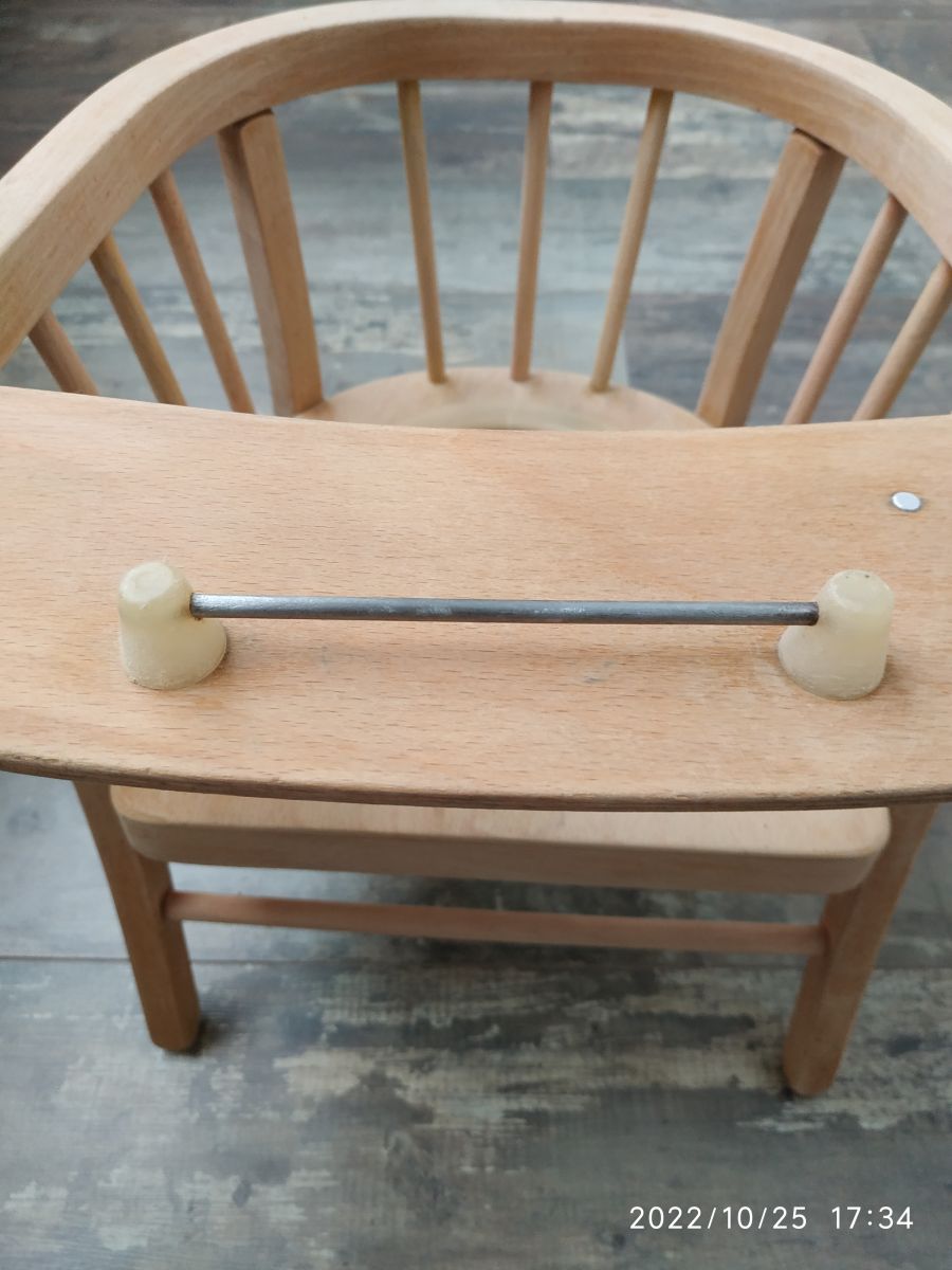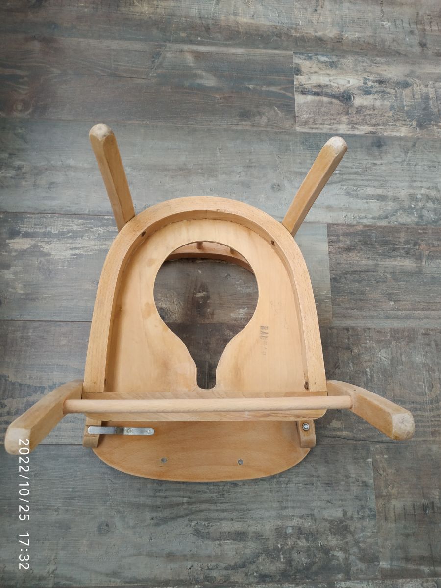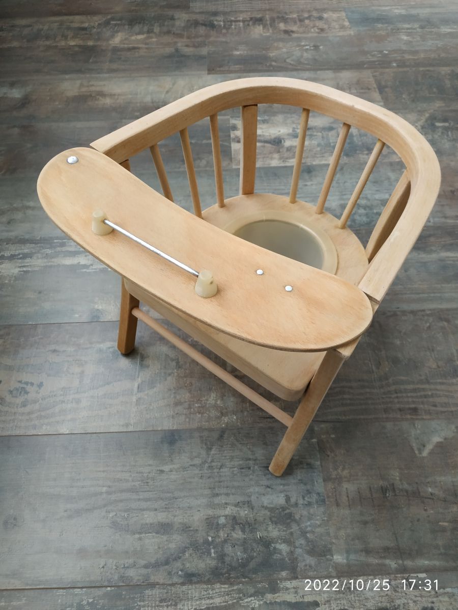 Chaise pot estampillée Baumann , bois décapé et poncé (vernis écaillé, peintures défraichies) et laissé brut. La tablette s'articule pour le passage de l'enfant.