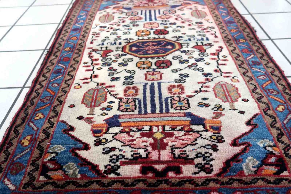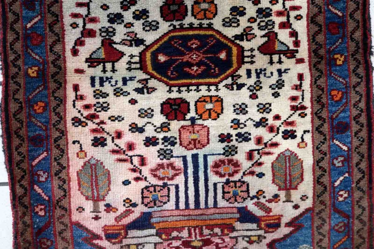 Handmade vintage Mahal ug in white color and with birds design. The rug is from the end of 20th century in original condition, it has some color run.