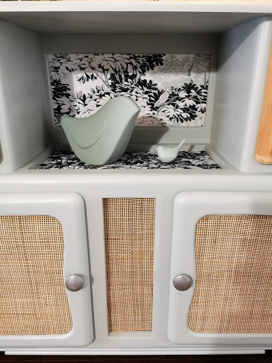 Upcycling d'un meuble ancien avec son charme et sa patine réveillé par ses portes en cannage de fibre végétal et ses motifs de feuillage dans la niche et derrière ses portes.