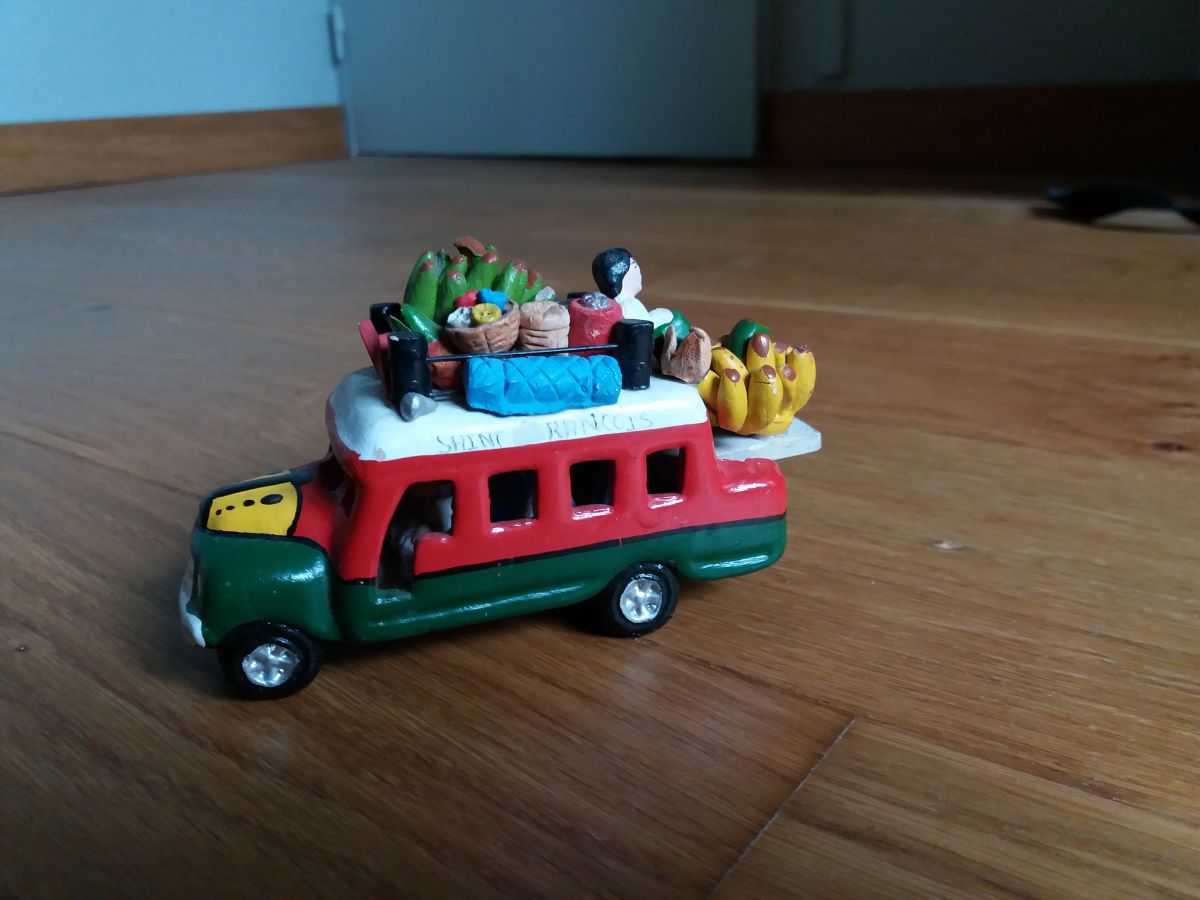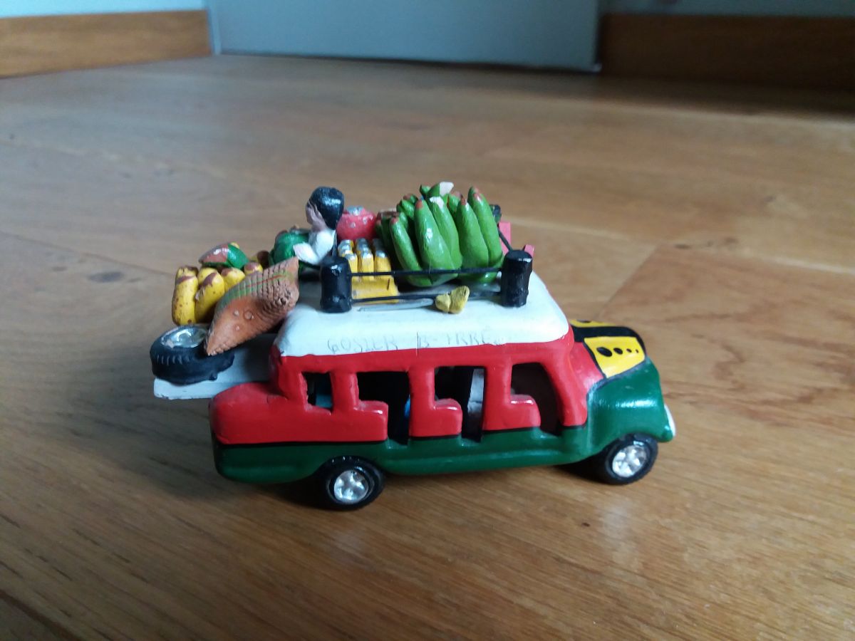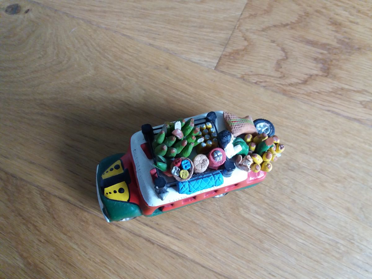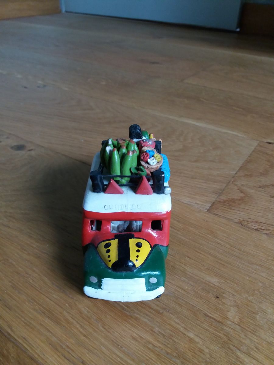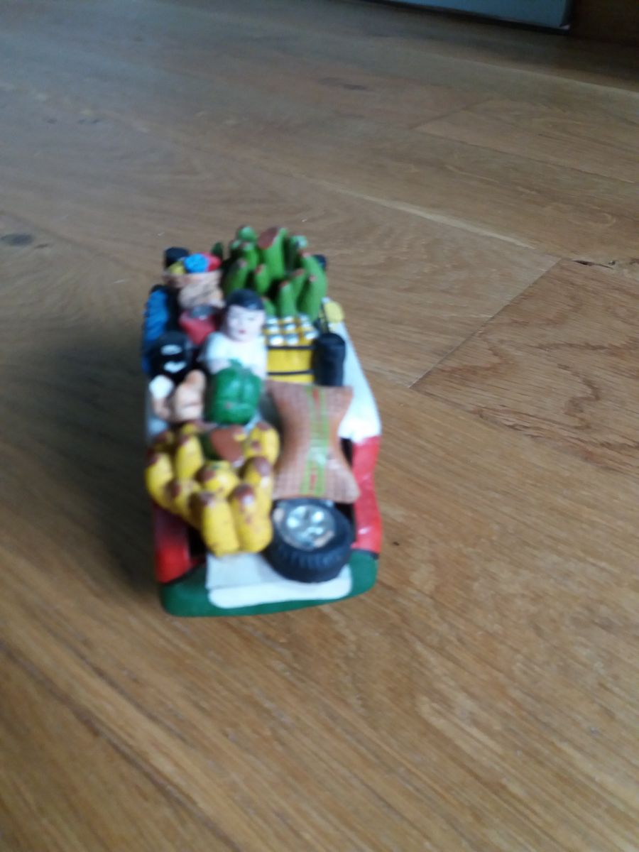 Joli petit objet représentant un véhicule, une sorte de mini-bus, avec des passagers à l'intérieur et surtout surmonté de toutes sortes de denrées et d'un petit personnage. C'est un travail très fin, avec de jolis petits détails, très colorés. J'ai du mal à déterminer le matériau, de la terre cuite peinte pour tout ou partie, peut-être du bois par endroit. Il doit s'agir d'un souvenir de voyage, car on peut lire quelques inscriptions ajoutées au stylo sur le véhicule, à moitié effacées par le temps : Saint François, Guadeloupe, Gosler Basse terre peut-être....Cela représente certainement les bus qui reliaient Basse-terre à Saint-François en Guadeloupe, et Gosler est peut-être le nom de l'artiste qui a créé cette pièce...Pièce qui date selon mes informations des années 70. Elle est en bon état général mais comporte quelques petits manques, sur les écritures, sur la peinture et sur quelques petits éléments comme par exemple les bananes. Ce véhicule mesure 12 cm de longueur, 5 cm de largeur, 7 cm de hauteur et pèse environ 120 g.