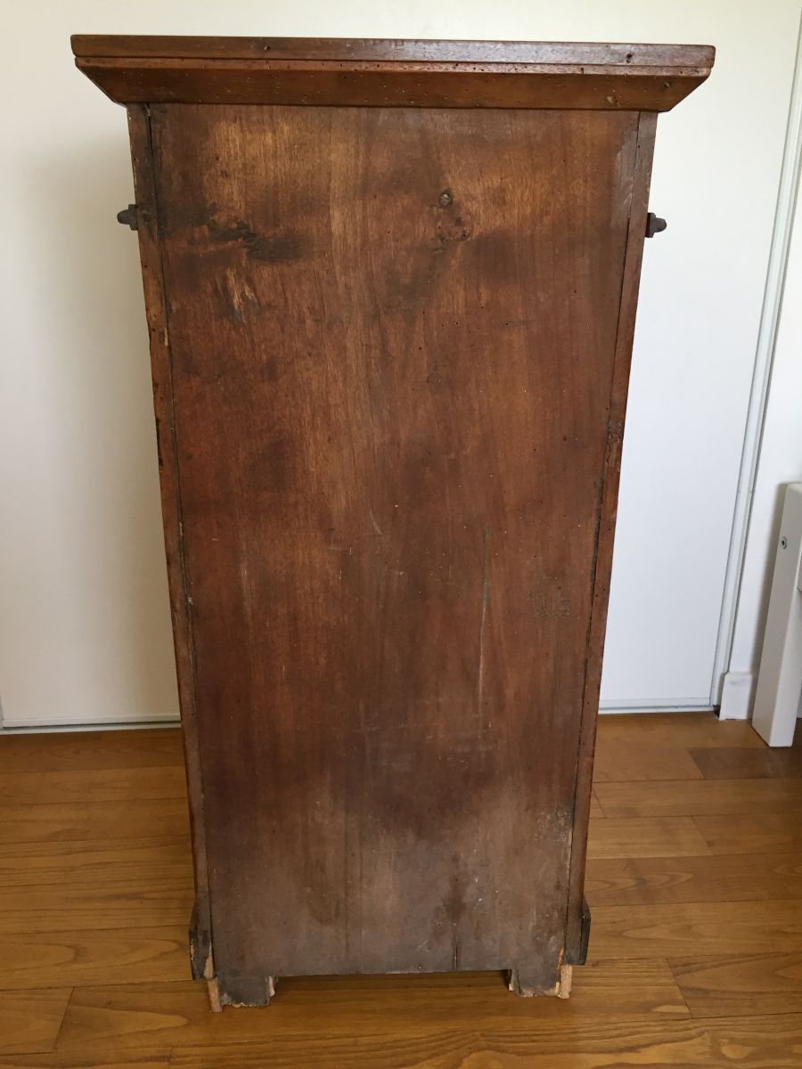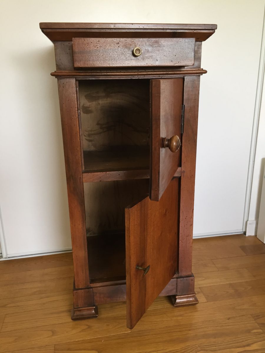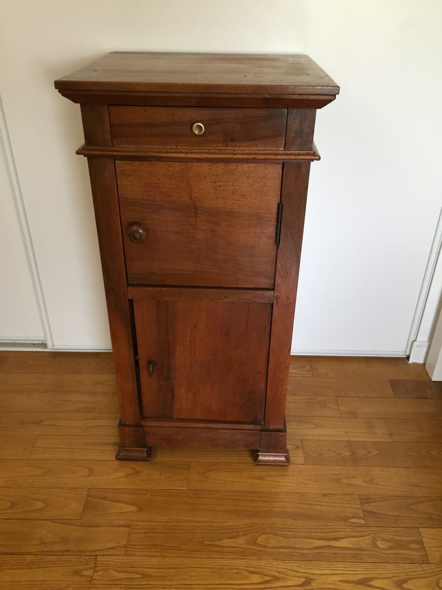 Table de chevet campagnarde ancienne en merisier massif, 2 portes, un tiroir. Très bon état.