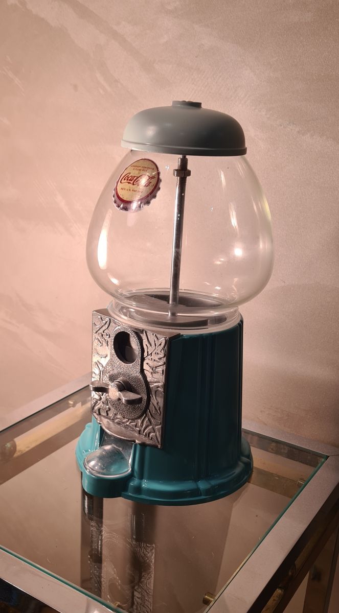 Distributeur de bonbon, chewing gum, cacahuète verre et metal couleur 2 tons de turquoise 30x16.