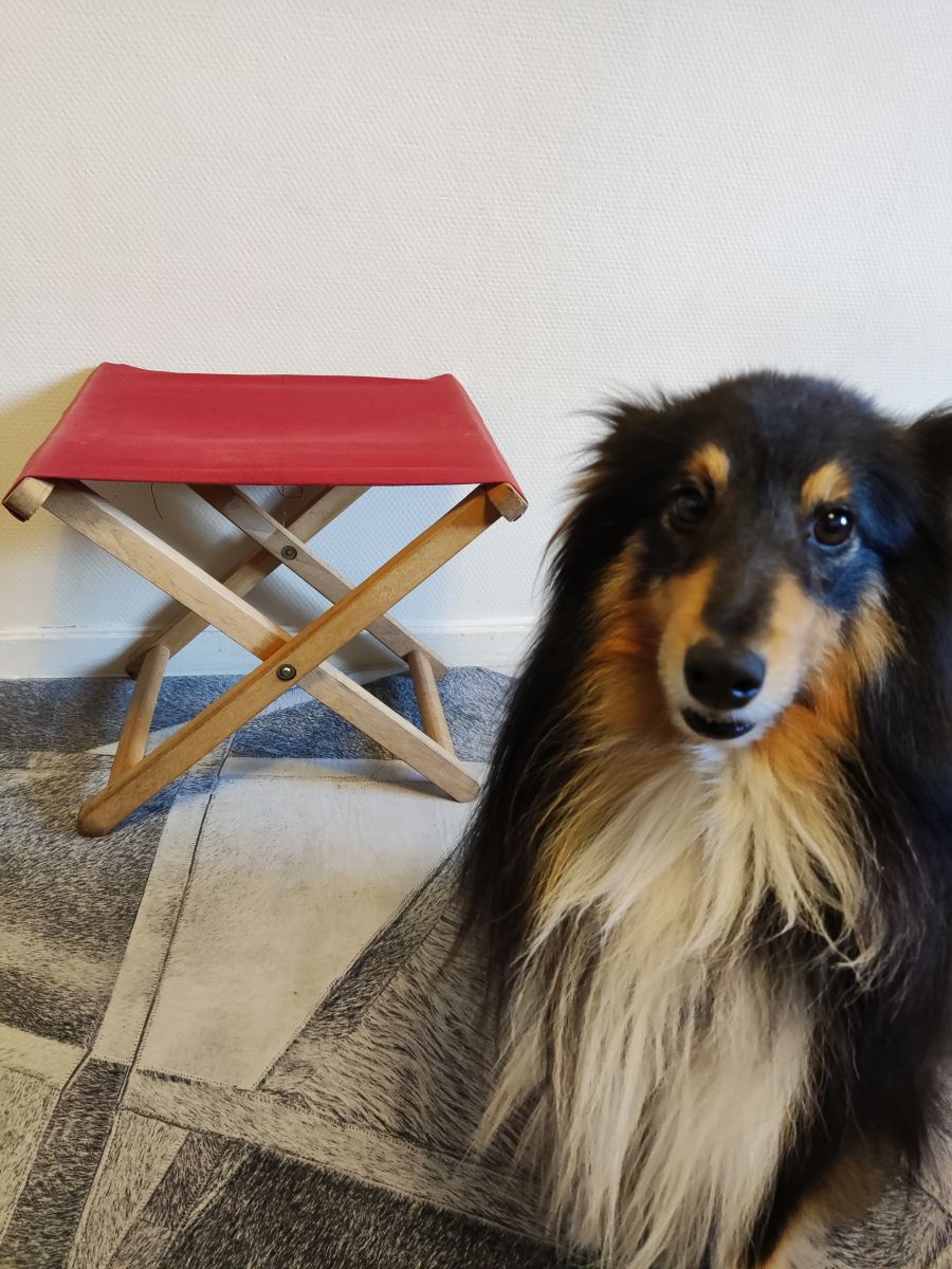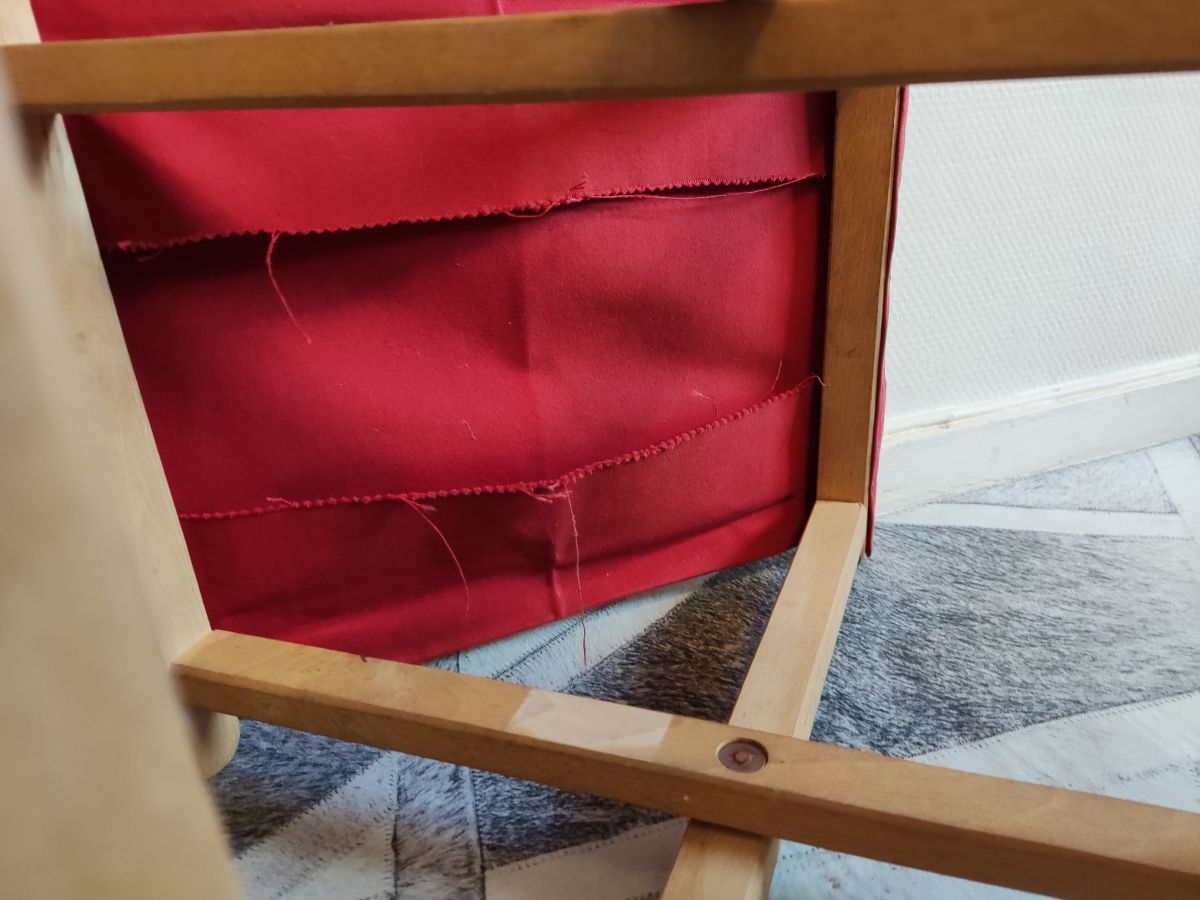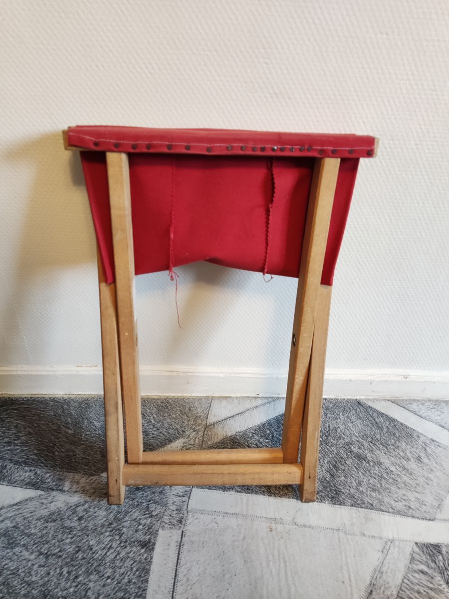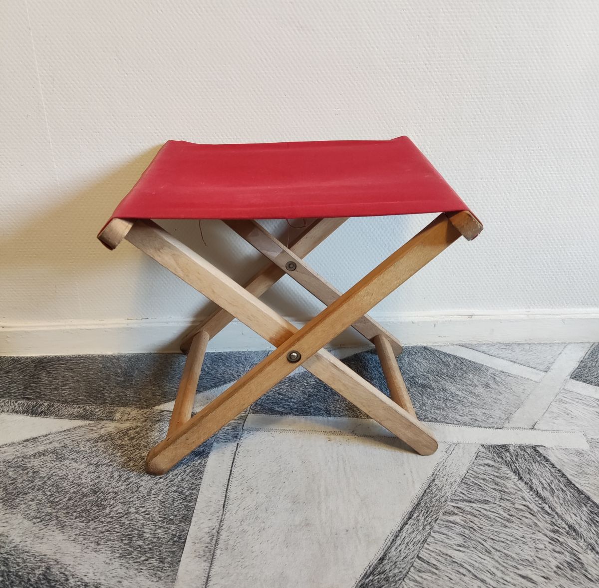 tabouret pliant avec armature en bois et tissu rouge en très bon état