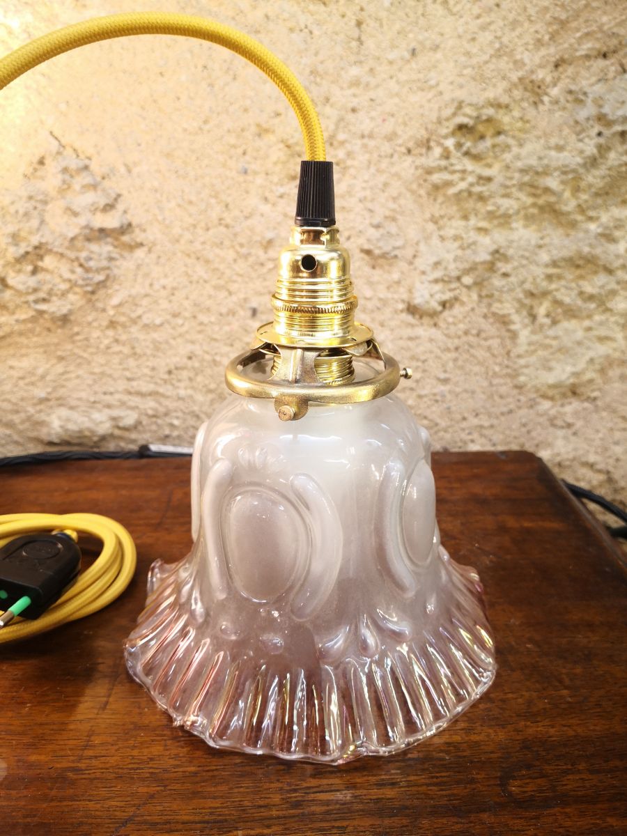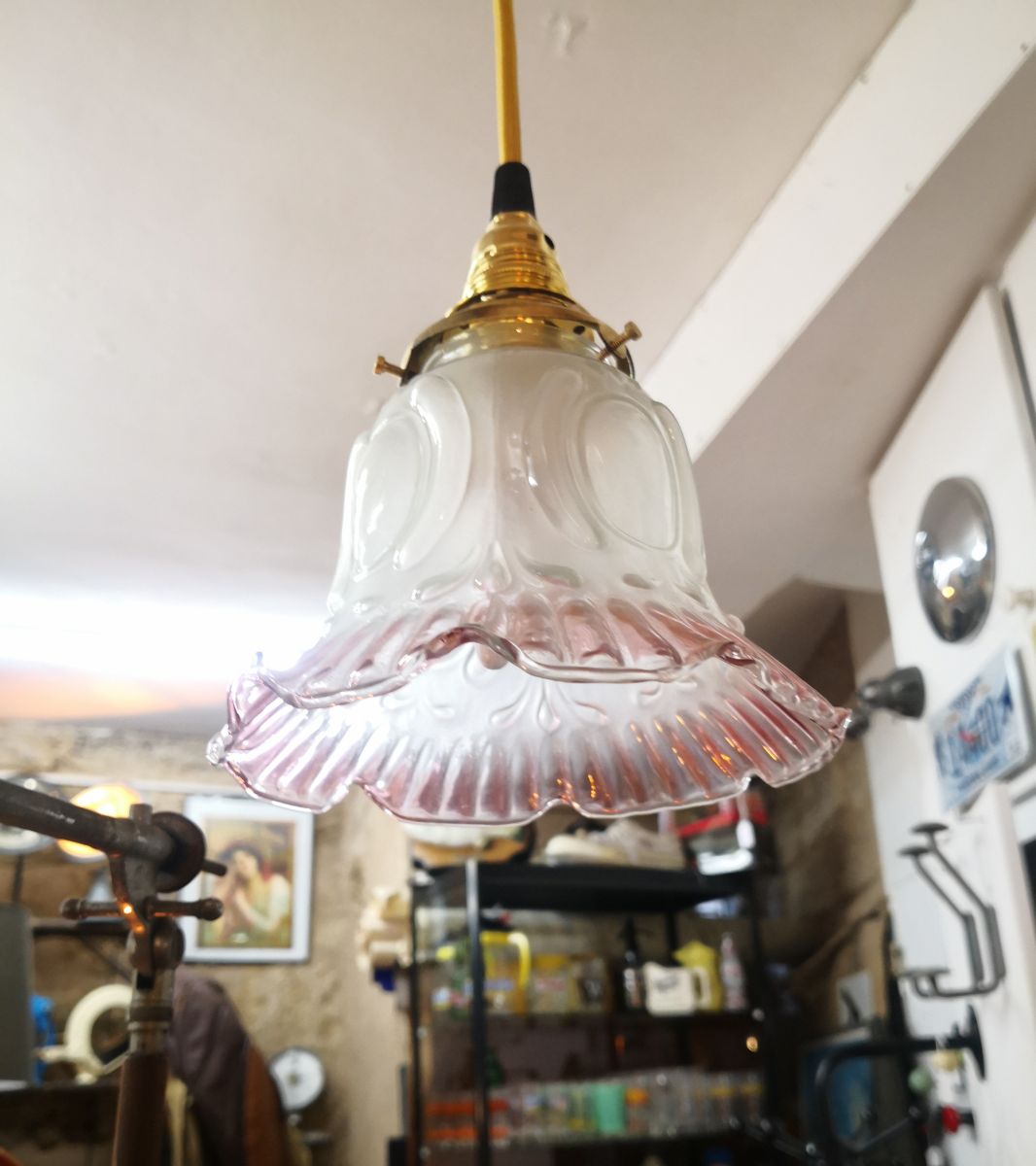 Baladeuse en verre vintage en verre blanc et rose, peut etre suspendue ou posée sur un meuble.