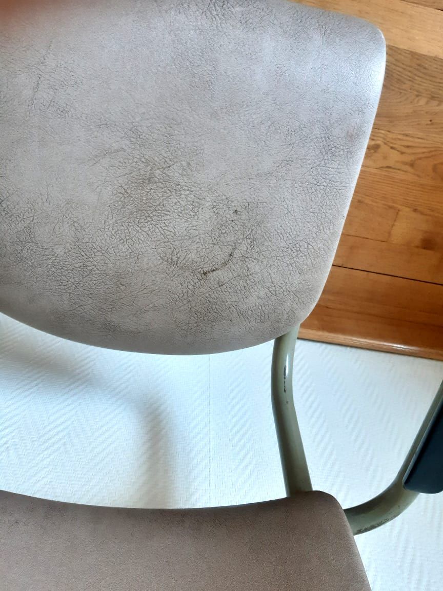Assise et dossier en skaï gris, structure en acier tubulaire gris, accoudoirs en bakélite noir.
