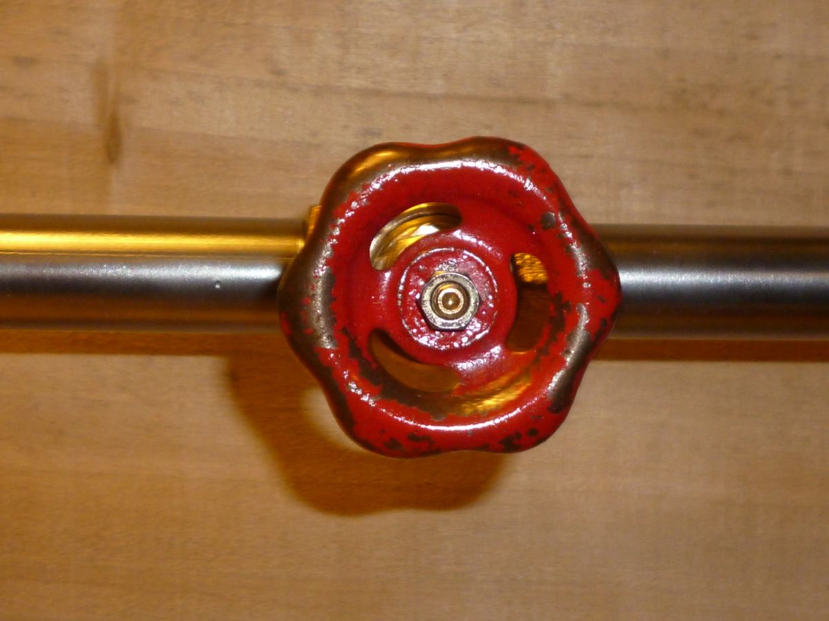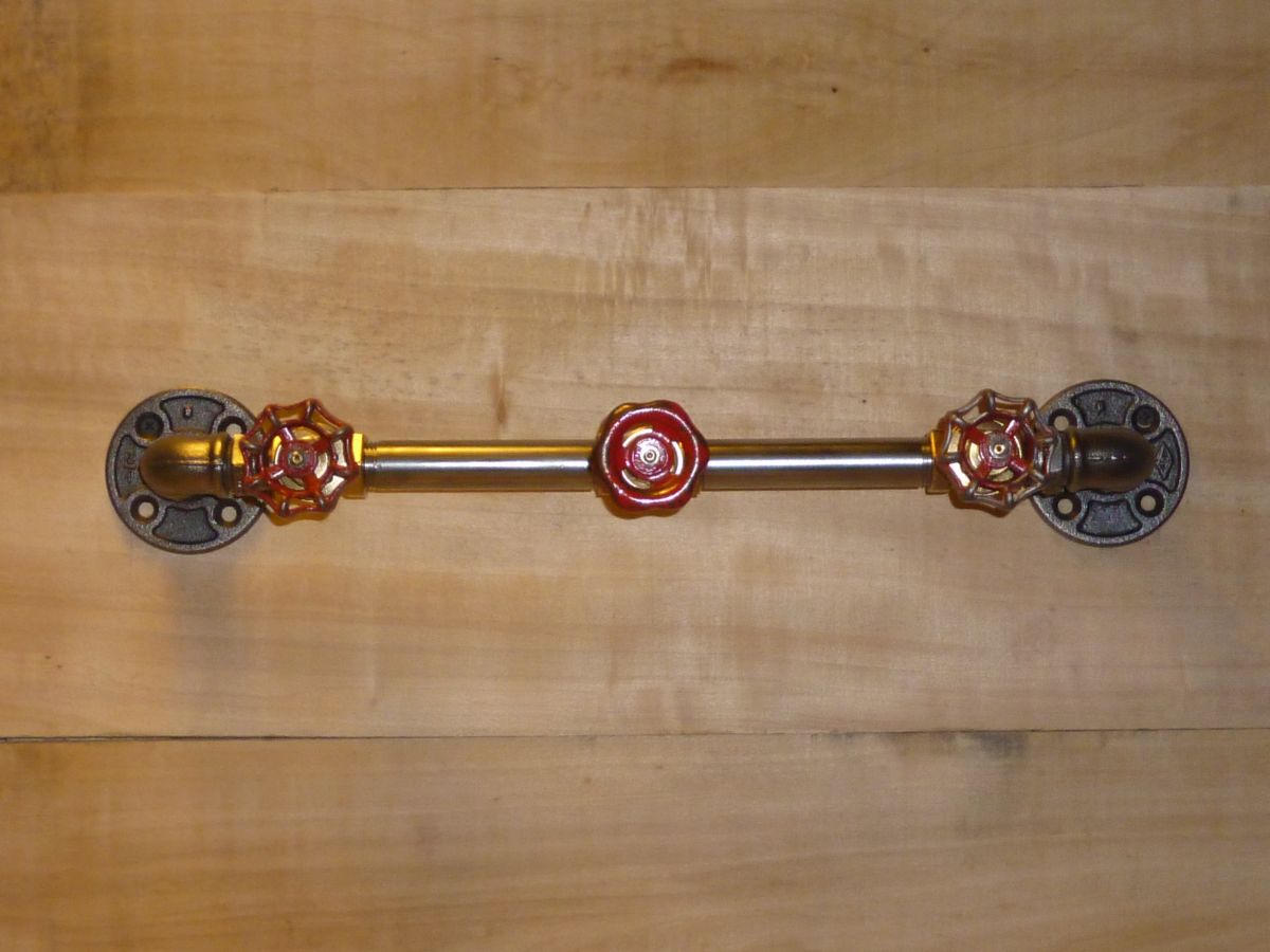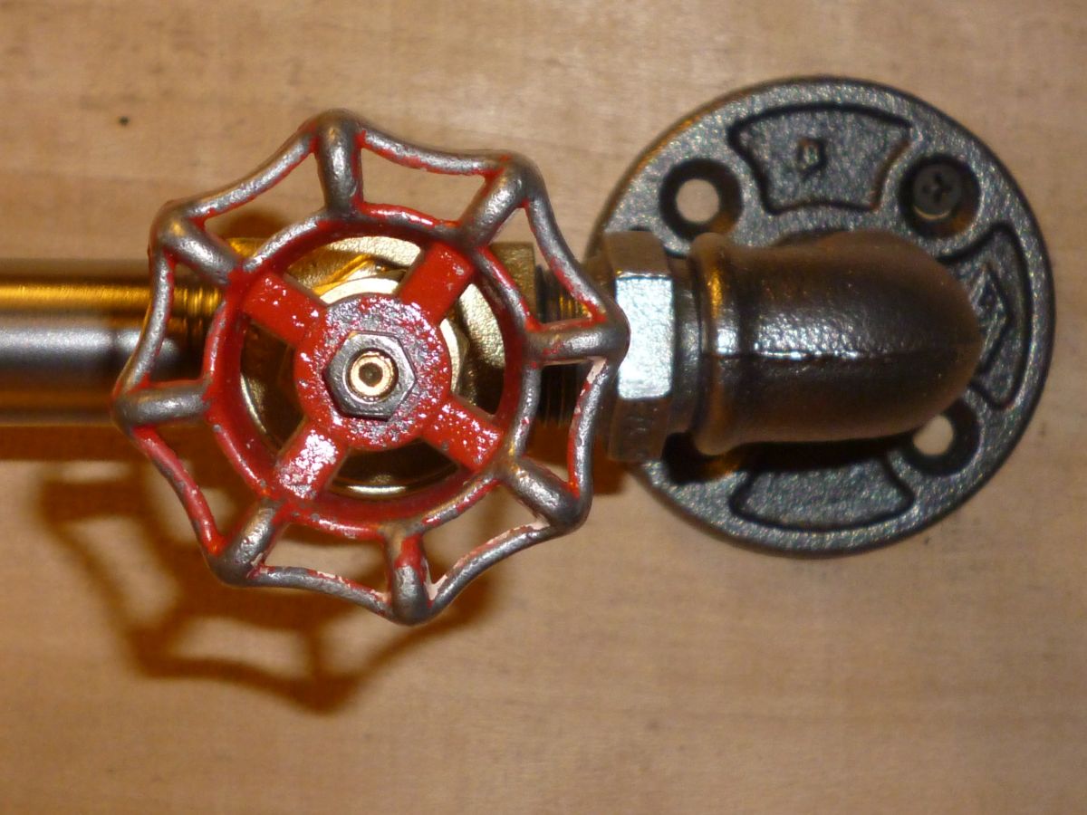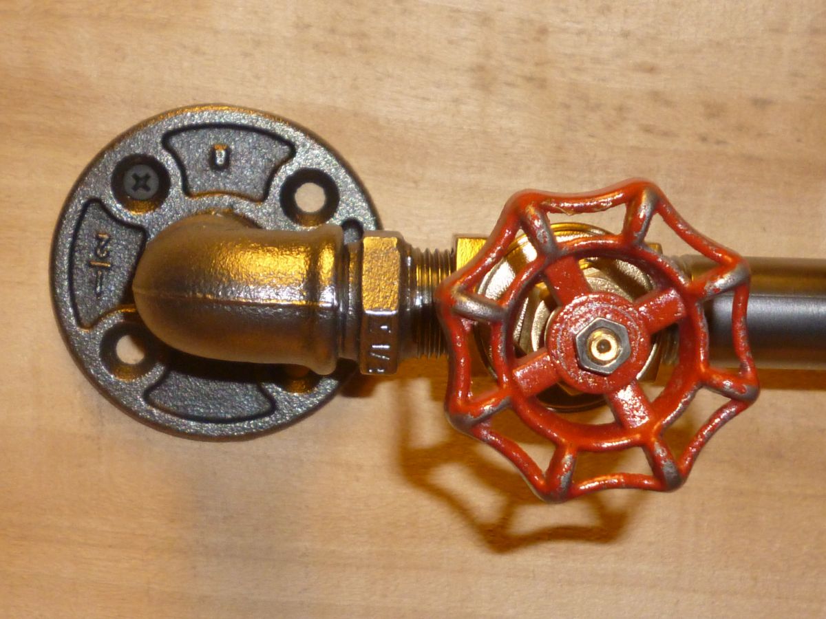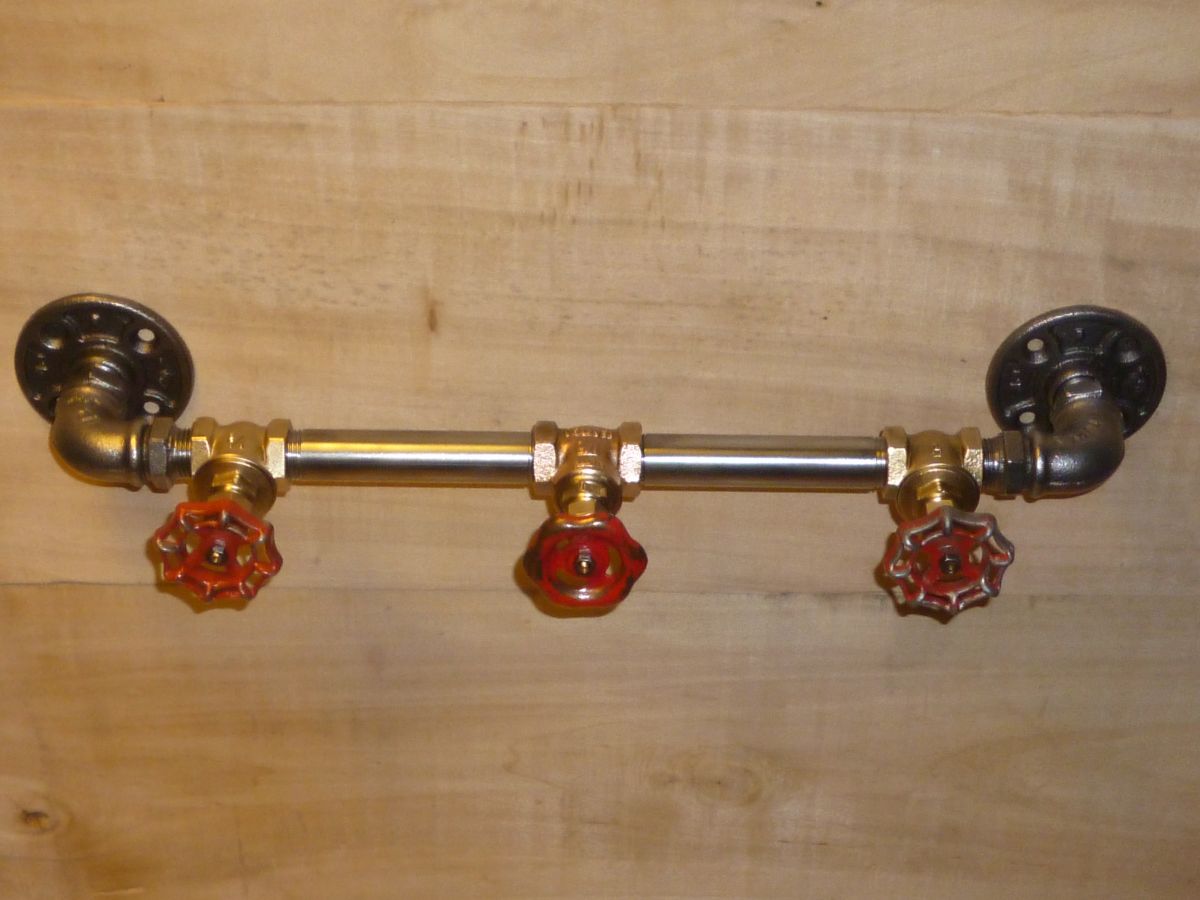 Porte-manteaux mural de style industriel réalisé a partir de 3 véritables vannes 1/2 pouce ( 15 x 21 ) en laiton a volant rouge , assemblées sur des tubes en acier , manchons , coudes , brides en fonte de fer .
