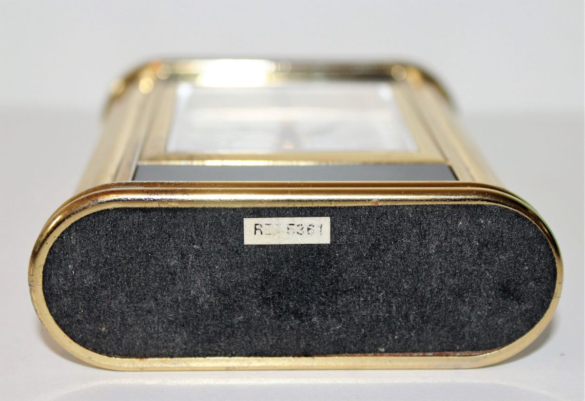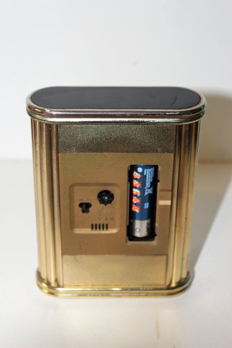 Réveil pendulette de marque JAZ, modèle G 5361, produit en 1993/1994. En ABS doré et décor laque noire, elle est équipée d’un mécanisme à quartz SEÏKO parfaitement fiable 30 ans après. Elle tient l’heure et la sonnerie du réveil fonctionne également. Il lui manque uniquement la trappe du compartiment à pile (modèle AA, fournie avec le réveil), ce qui ne l’empêche nullement de fonctionner. En bon état d’usage, quelques rayures et taches conformes à l'âge. Dimensions : 9,5 x 3,5 x 12 cm.