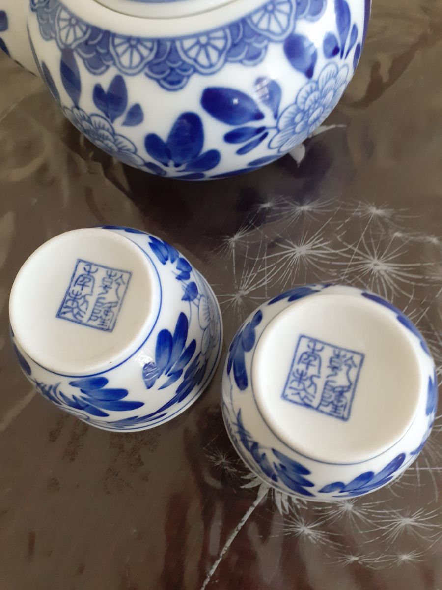 Coffret porcelaine asiatique.1 theiére + 4 tasses avec signature au dos.Couvercle fragile un peu cassé mais il ferme.Le reste est en parfait état.Dimensions theiére 15cm L x 8cm H et tasses D 6cm x 5cm H.
