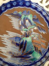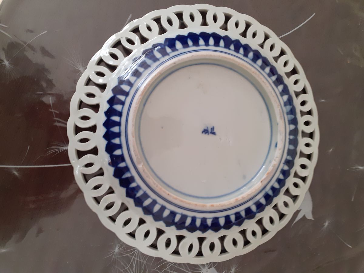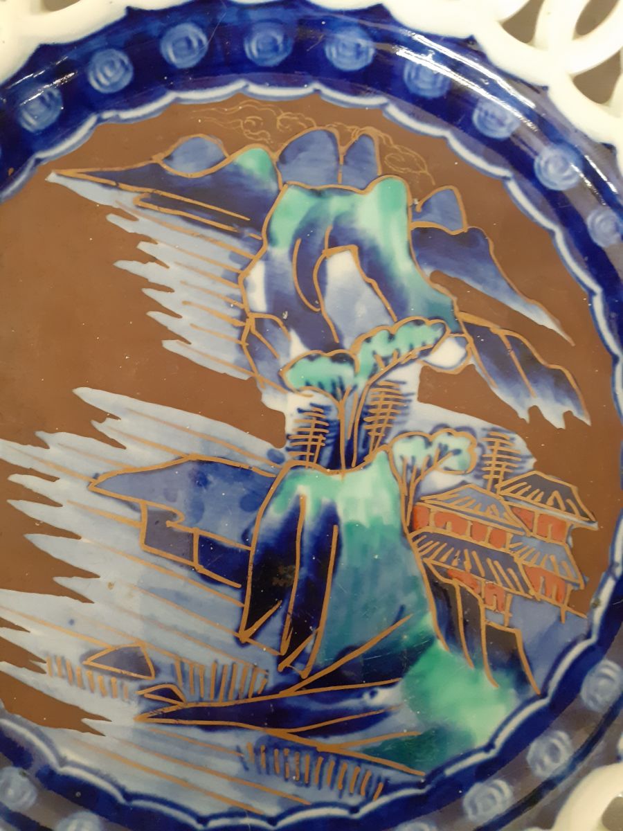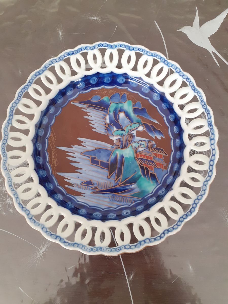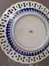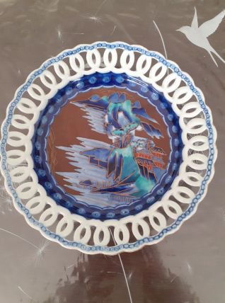 plat corbeille porcelaine japonais ajouré style Imari.Signature au dos signifiant selon recherches: saison,ici apparament le printemps.Bon état, belles couleurs.Dimensions: 22cm x 4cm.