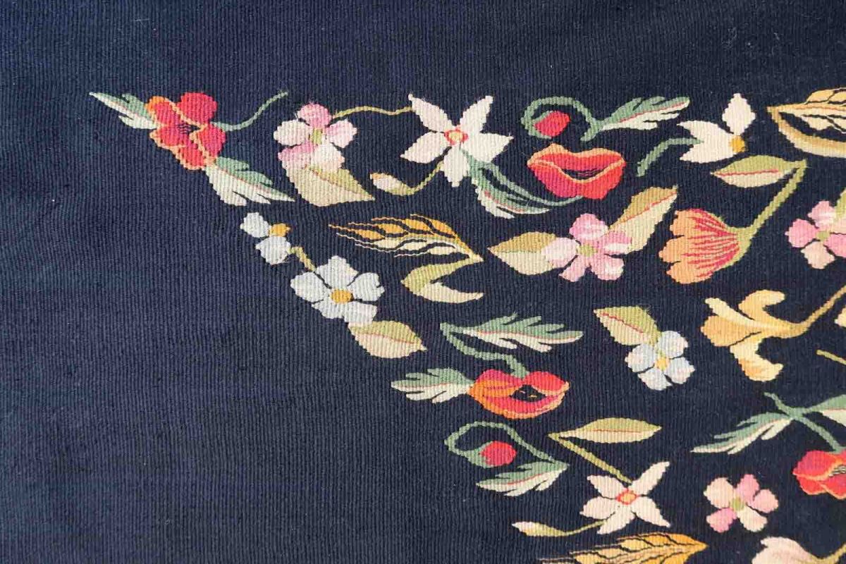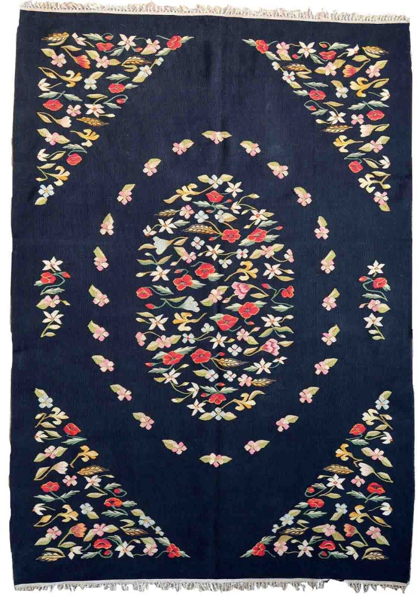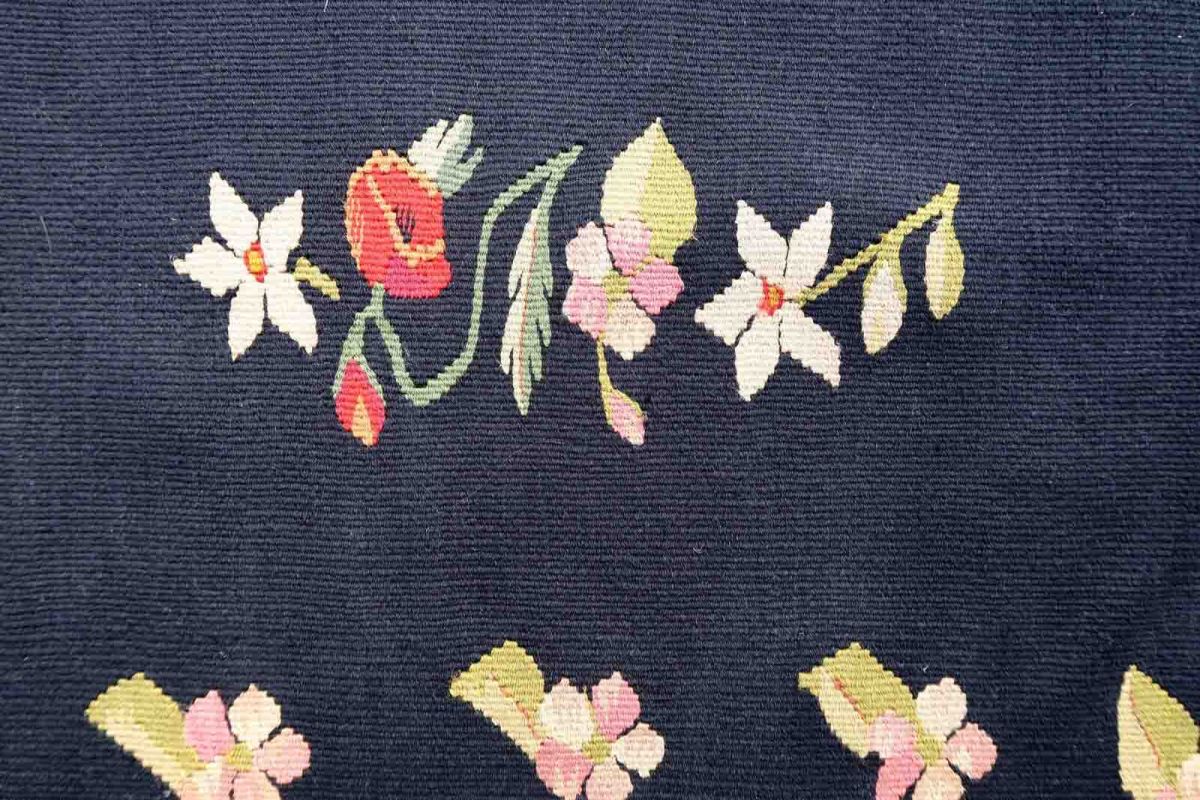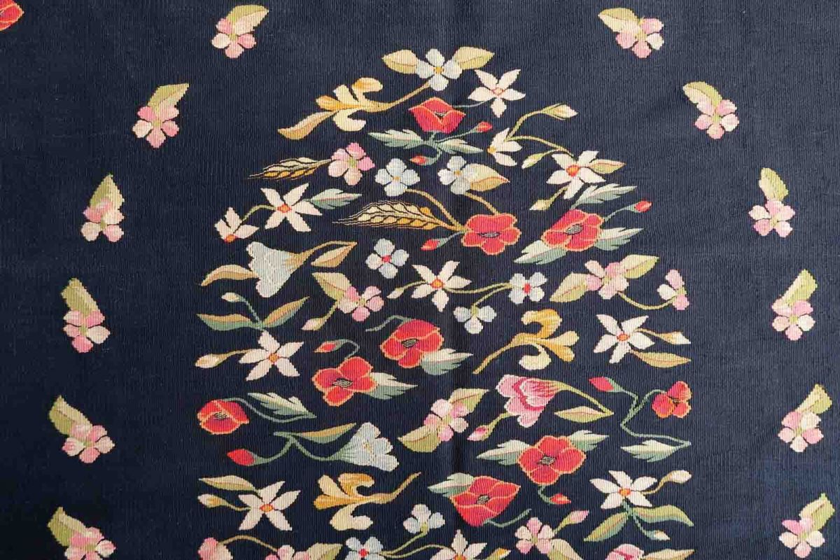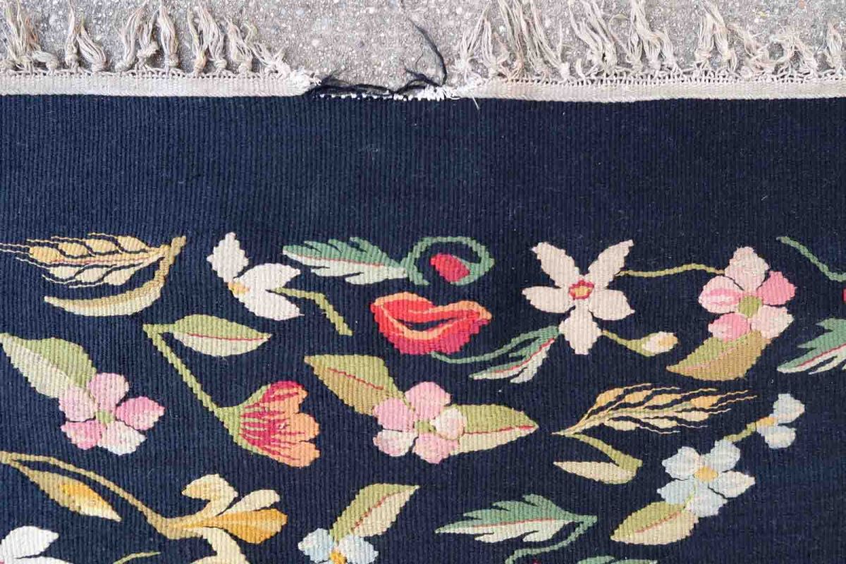 Handmade vintage kilim in black color and floral design from Romania. This Bessarabian rug is in original good condition, made in wool. The rug is from the middle of 20th century.