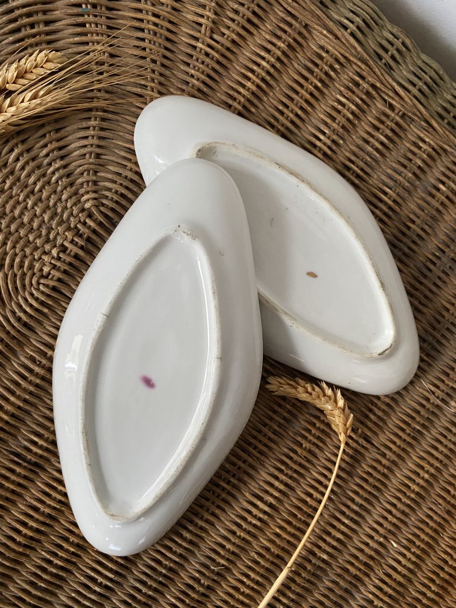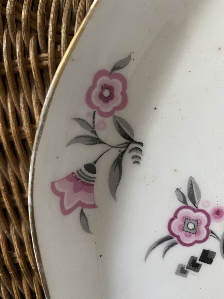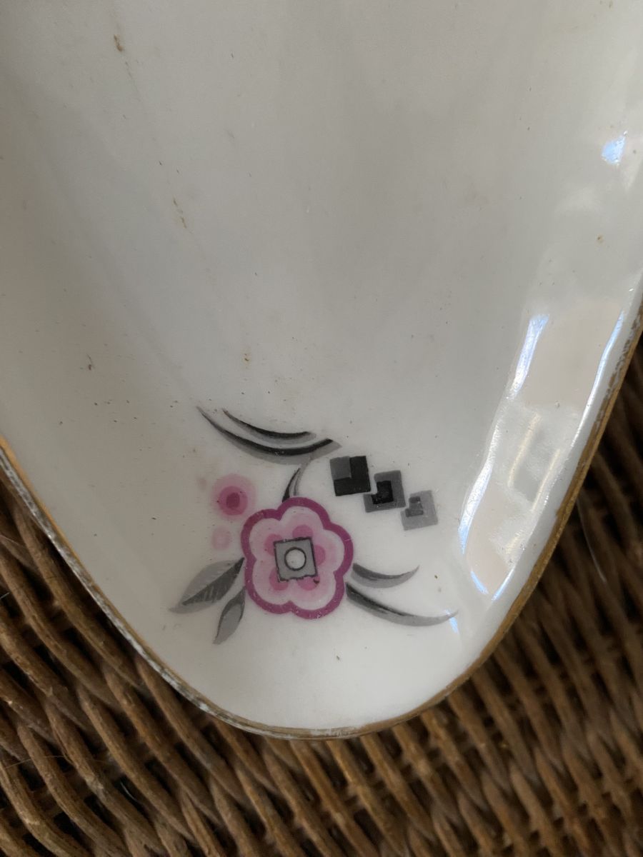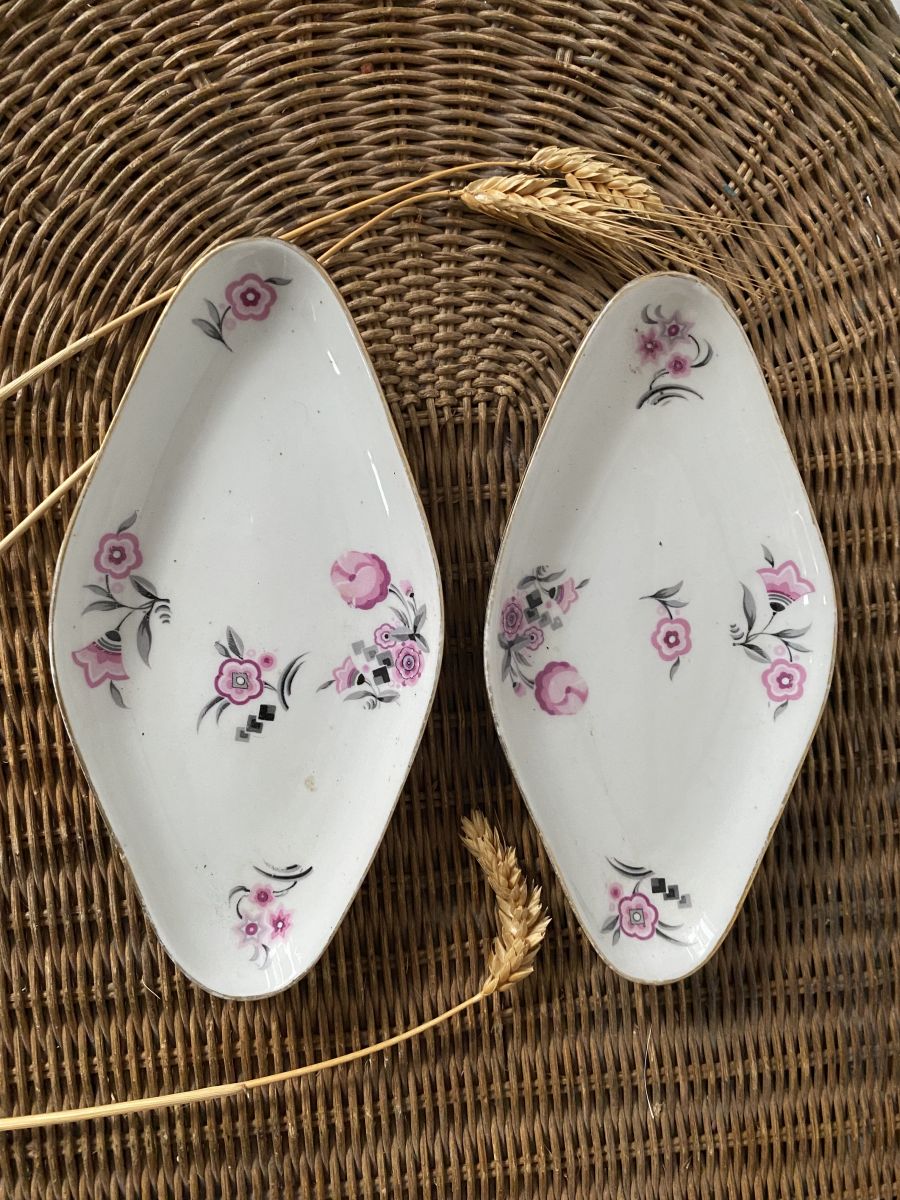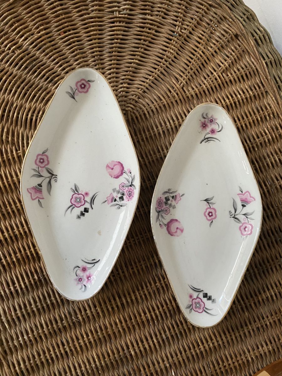 Paire de raviers motif style art déco , aux fleurs roses raffinées et à la bordure dorée.
