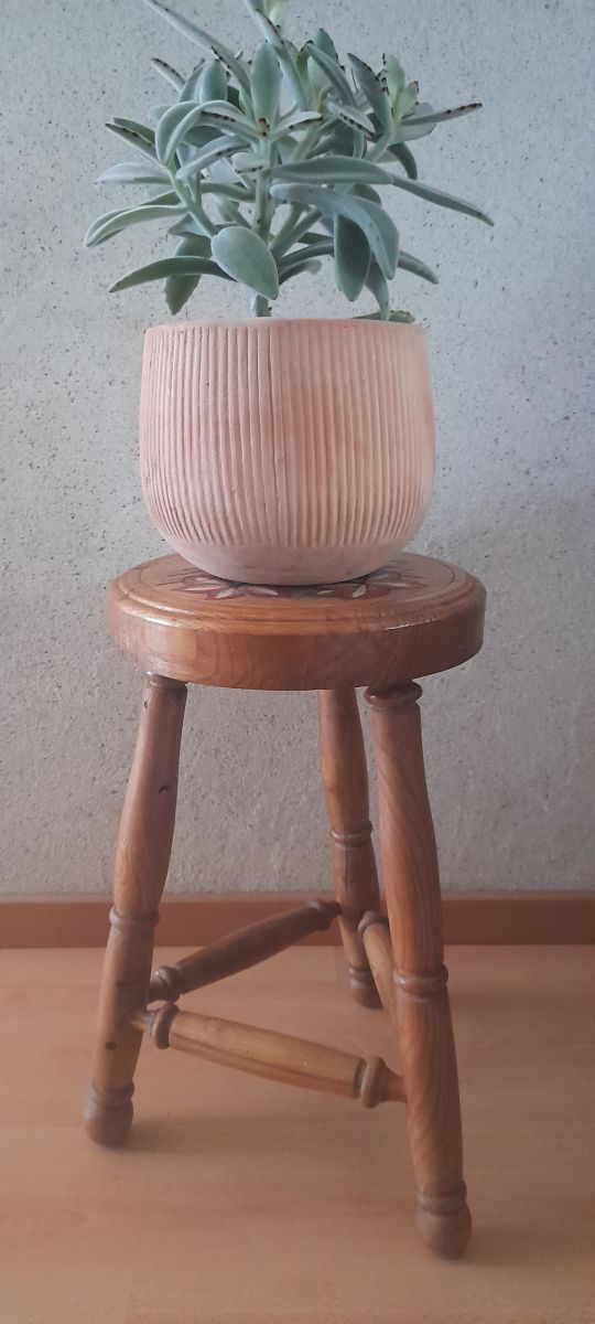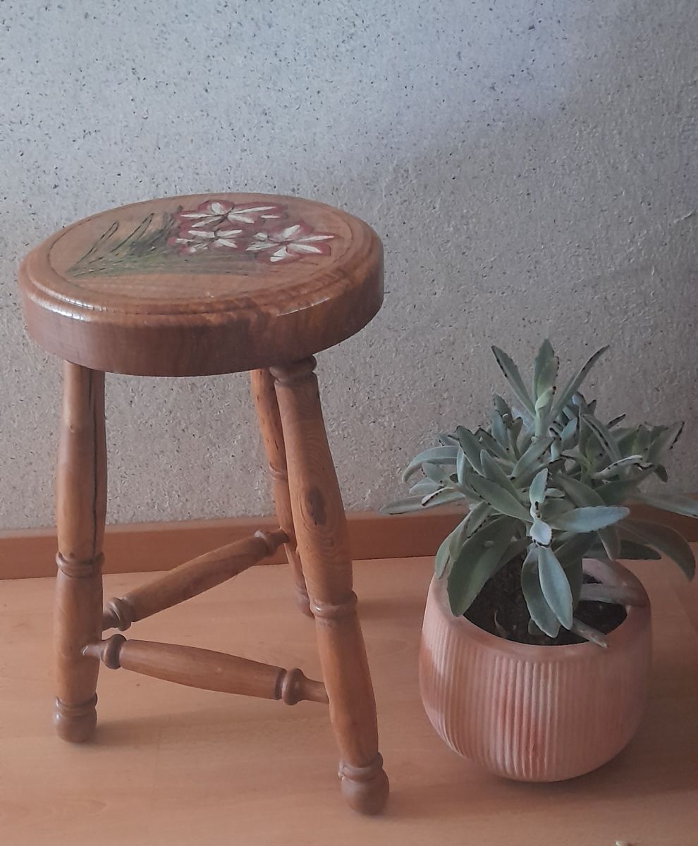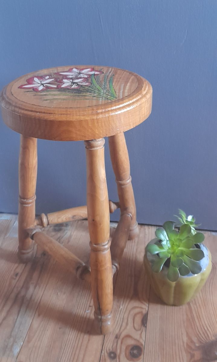 Tabouret en bois massif bien campé sur ses 3 pieds, il est très solide. Les pieds sont tournés et l'ensemble est vernis clair avec une assise bien stable sur laquelle quelques fleurs ont été gravées et dessinées. Cette finition lui donne un côté unique et atypique car il n'est pas courant de voir ces objets du quotidien être décorés.