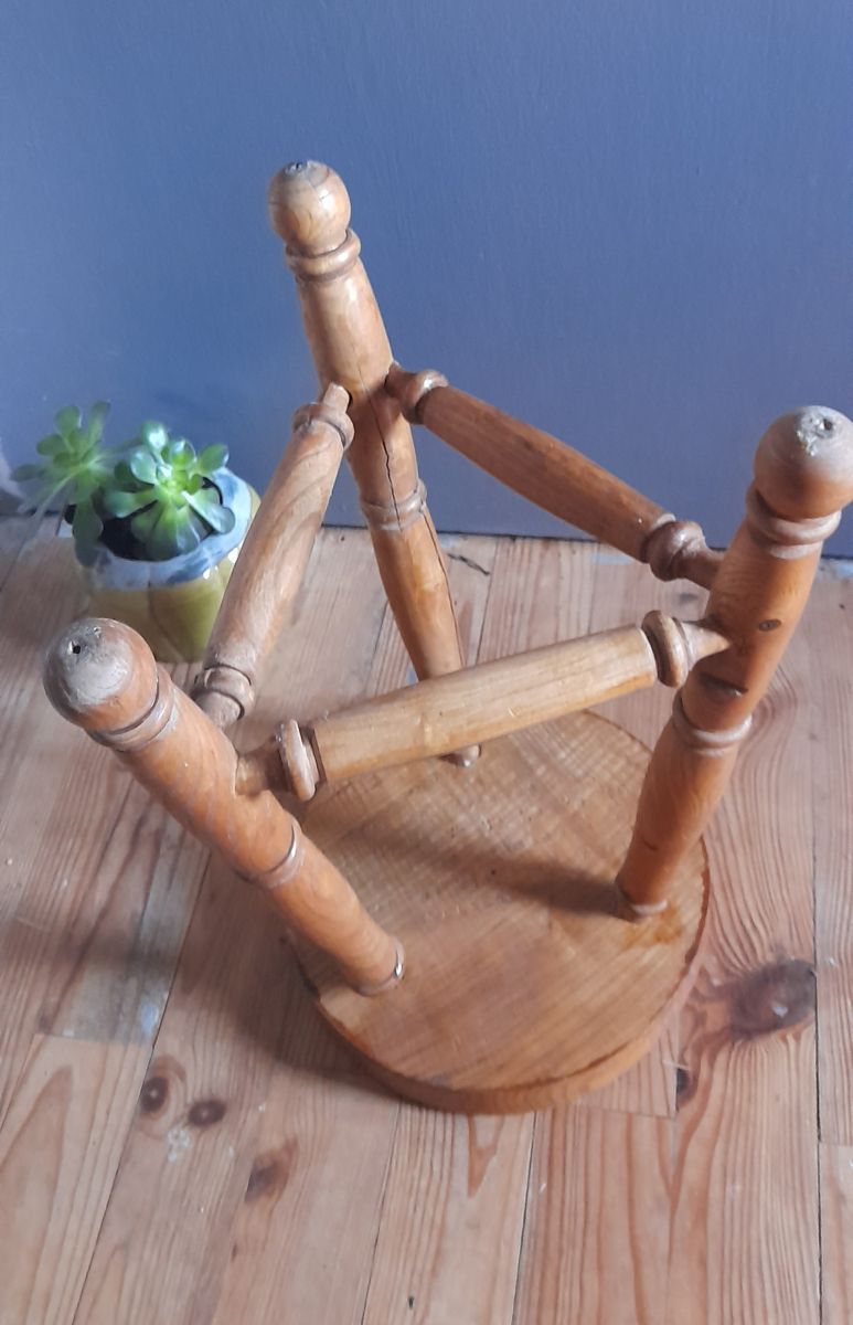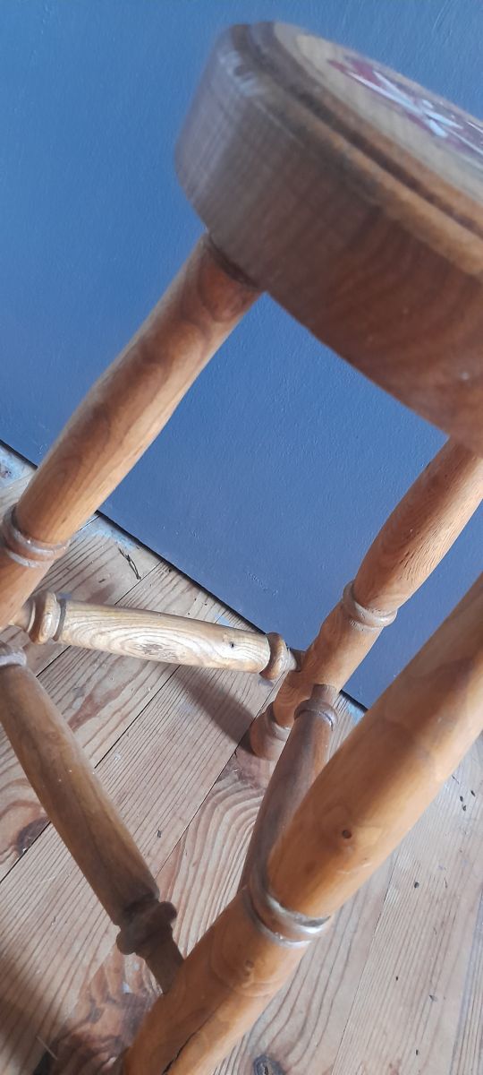 Tabouret tripode bois massif pieds tournés, assise décor fle