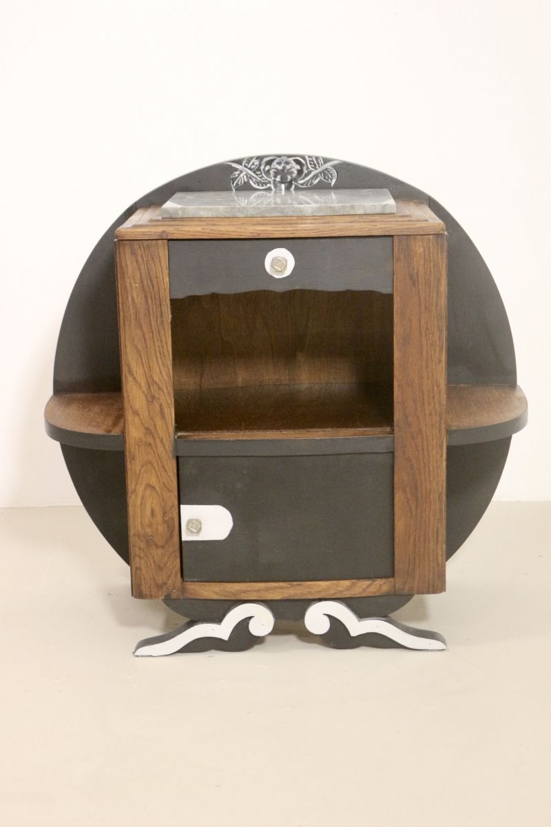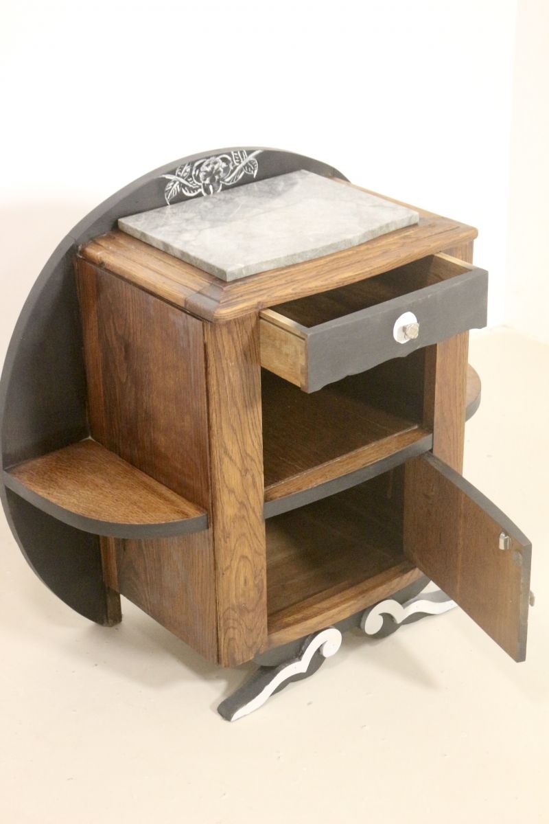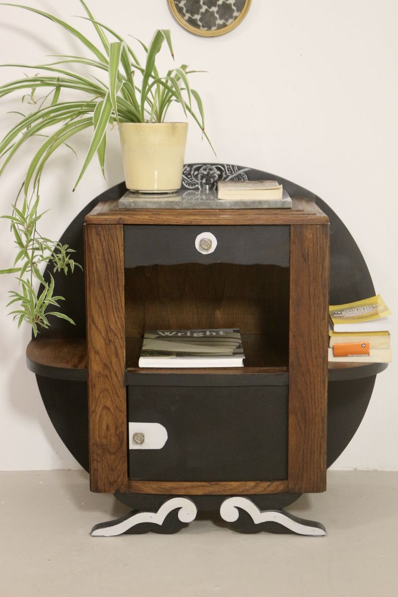 Très jolie table de chevet originale par sa forme atypique datant des années 50 60. Des lignes élégantes et des courbes originales seront parfaites pour s'intégrer dans une chambre un salon ou un couloir..