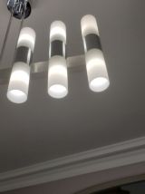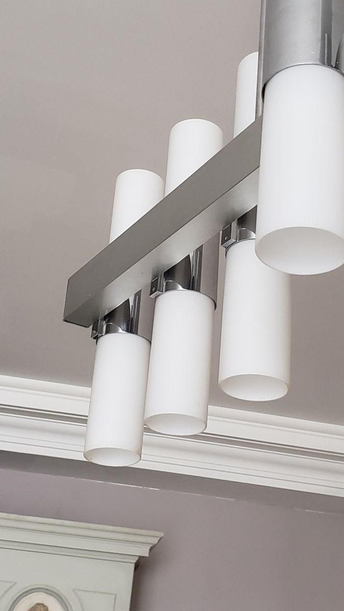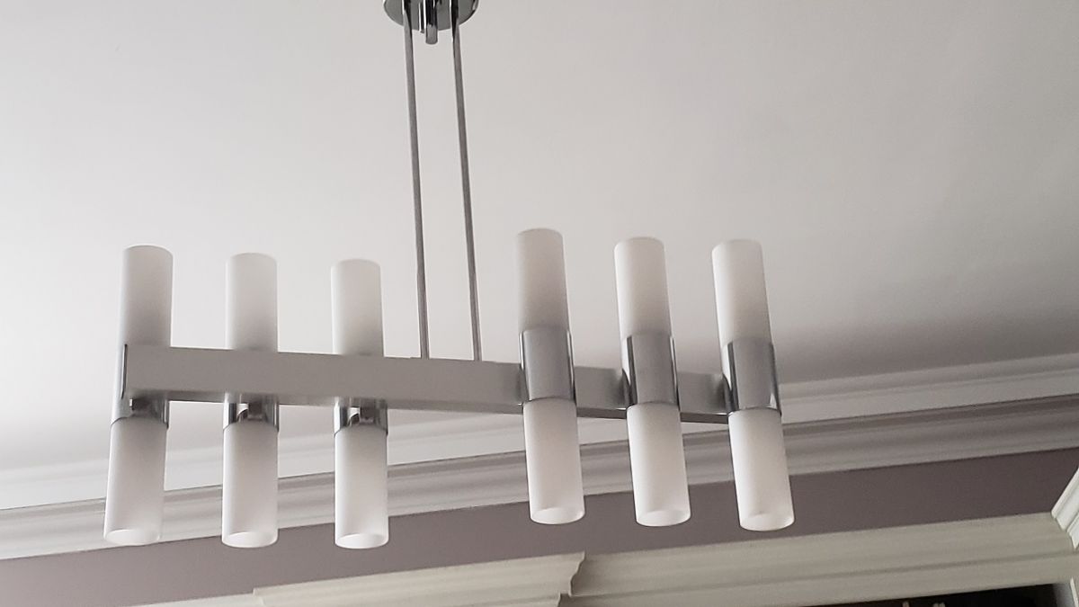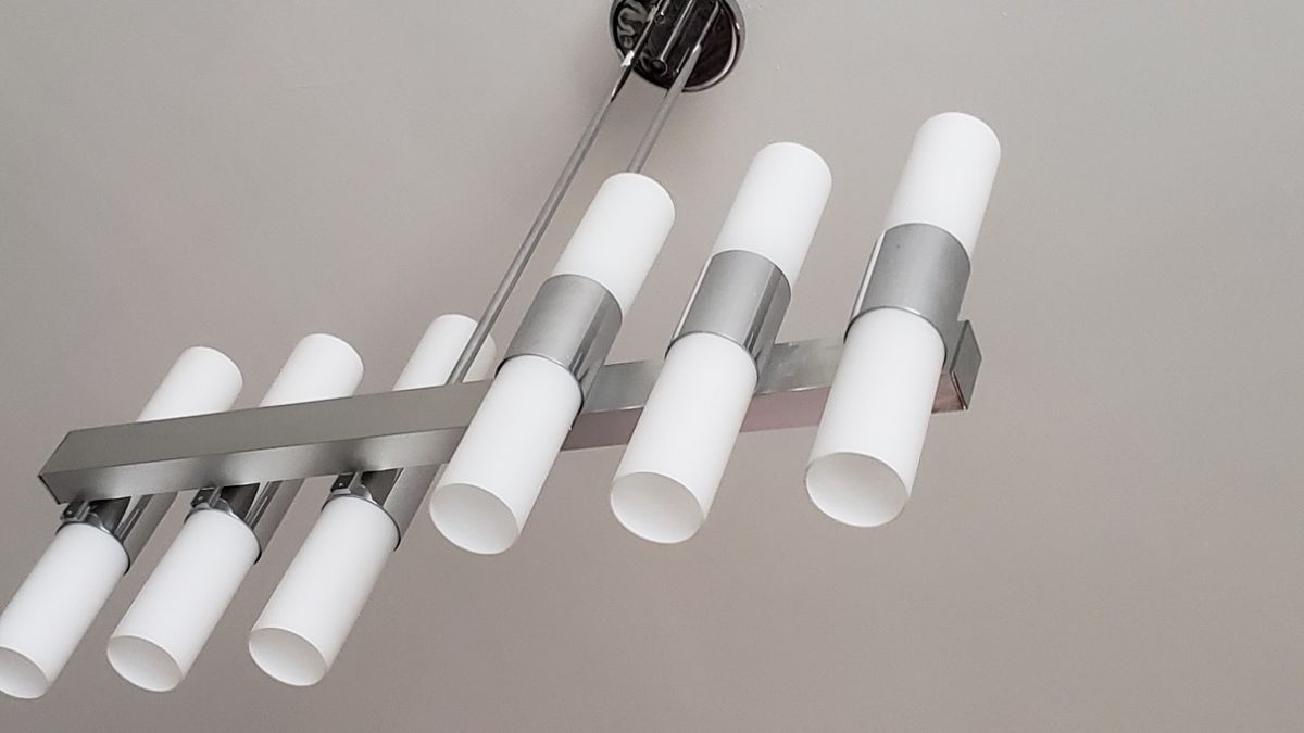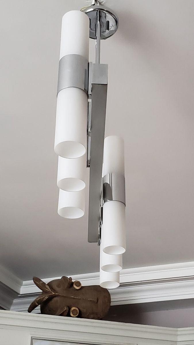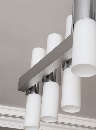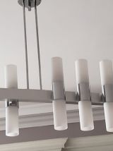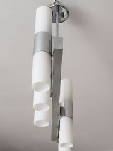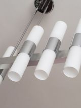 Lustre en métal chromé et verres tubulaires opalescente à douze lumières. 70 x 72 x 15 cm.