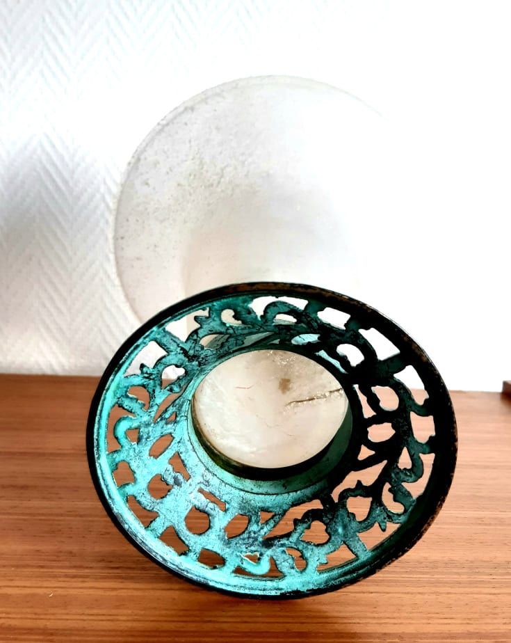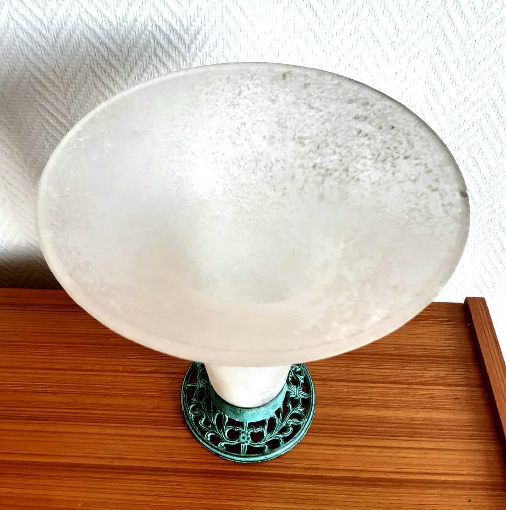 Vase de forme tulipe en verre givré , pied en fonte à décor de fleurs ajourées.