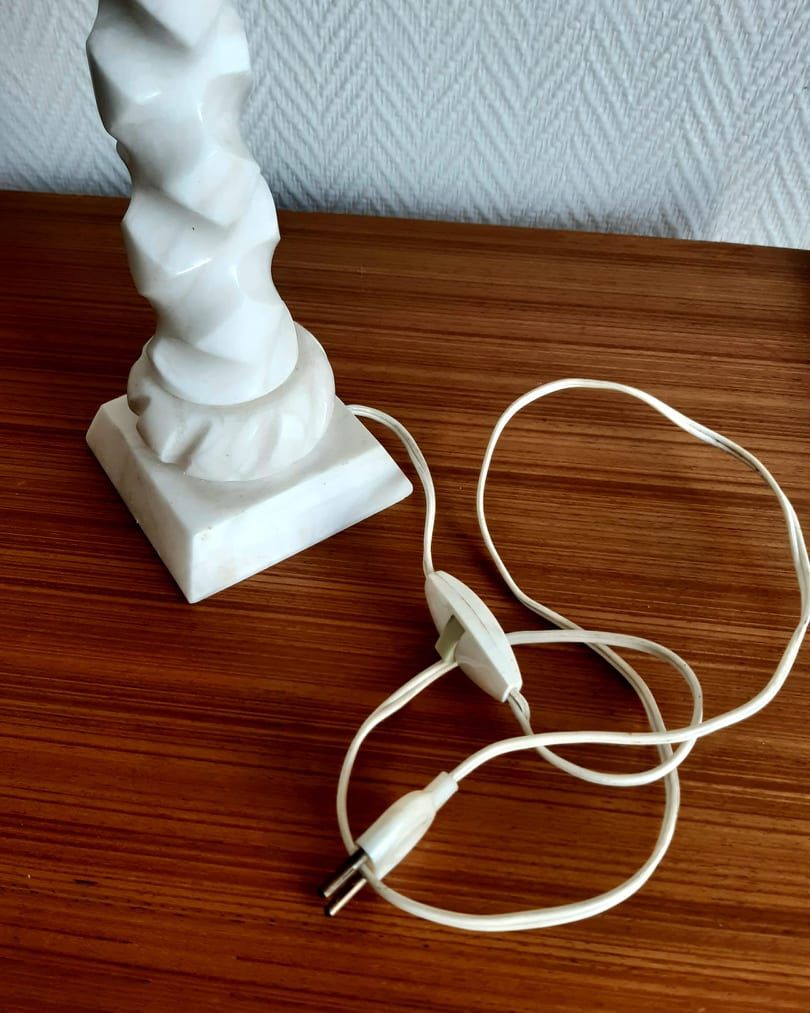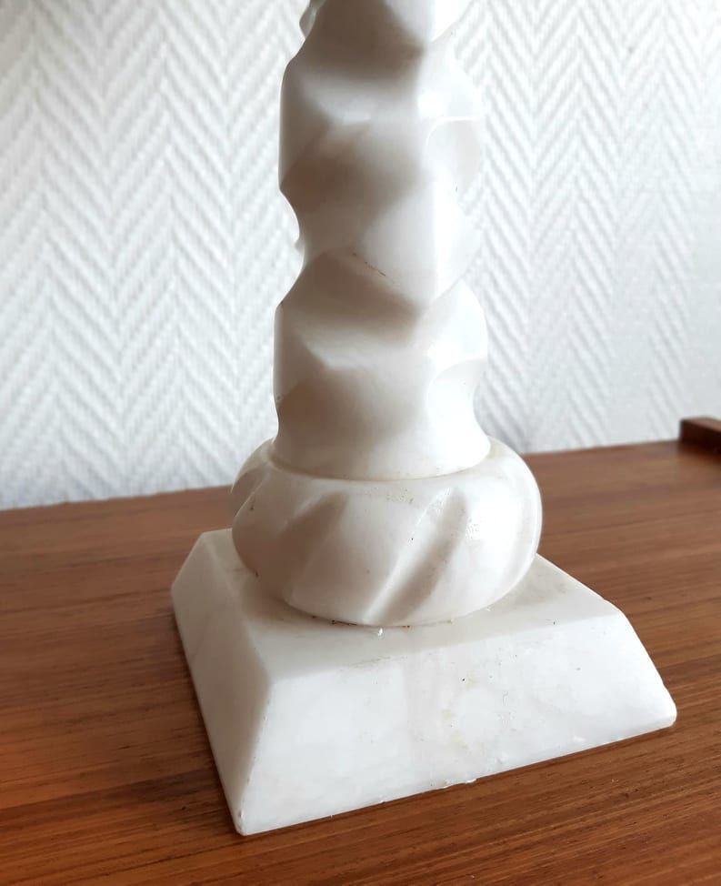 Pied de lampe en albâtre blanc travaillé en fut de colonne torsadé à base carrée.