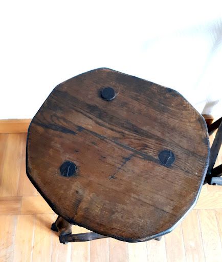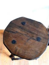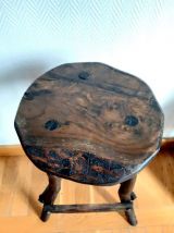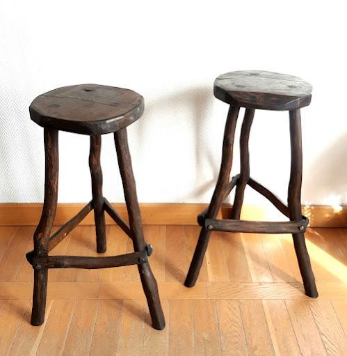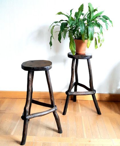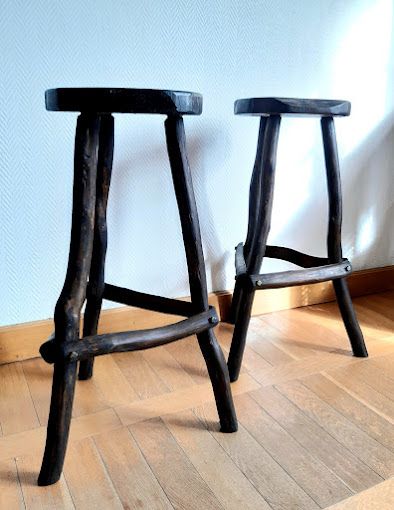Bois travaillé de façon brutaliste, formes irrégulières. Les tabourets étaient recouverts d'une peinture noire, ils ont été entièrement décapé et nourris, aussi il reste quelques minimes traces de la peinture.