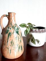 Verseuse ou pichet en céramique vintage, à décor émaillé de tâches vertes sur un fond rose pâle. Inscription en creux au dos sous la prise.