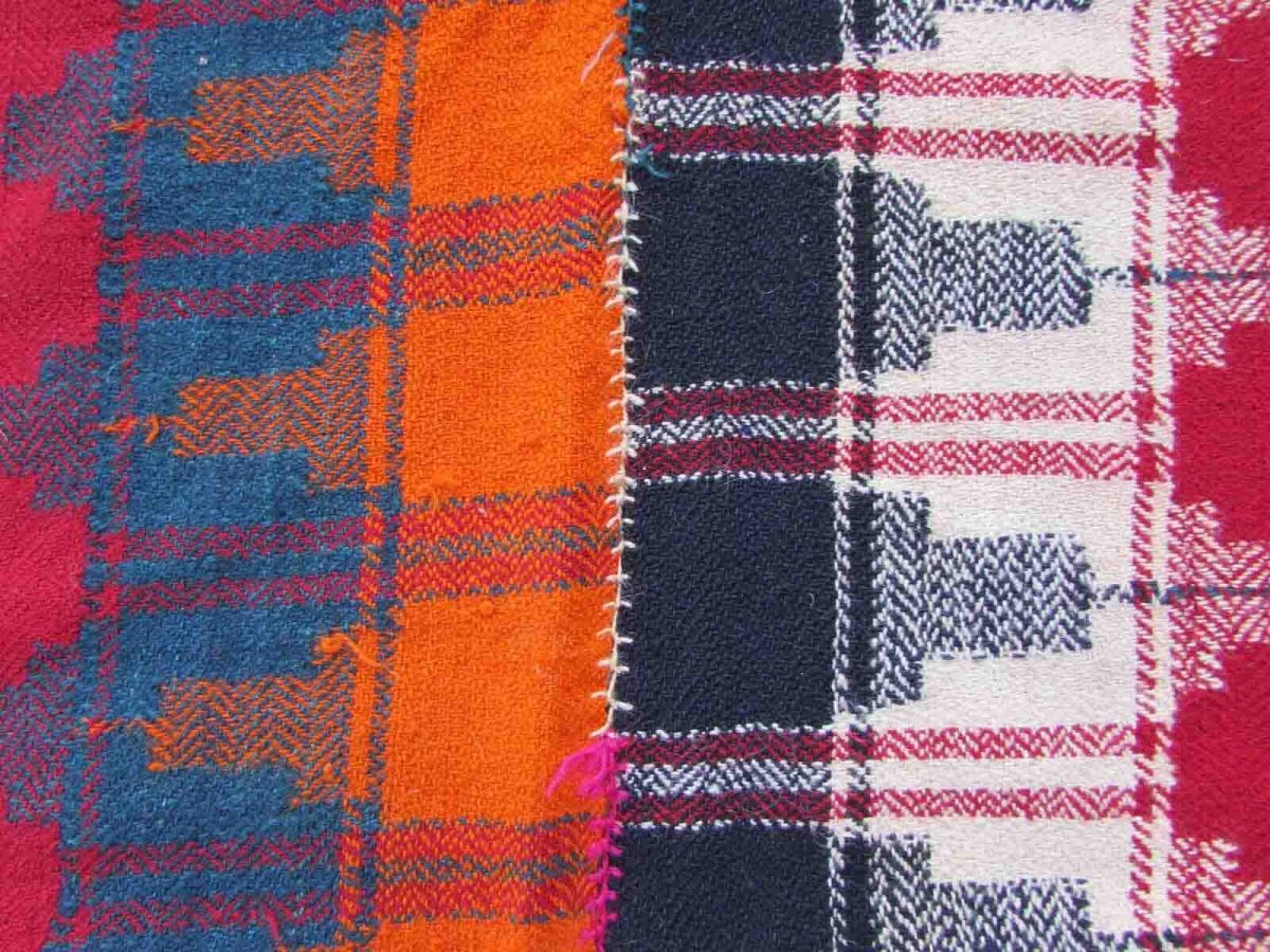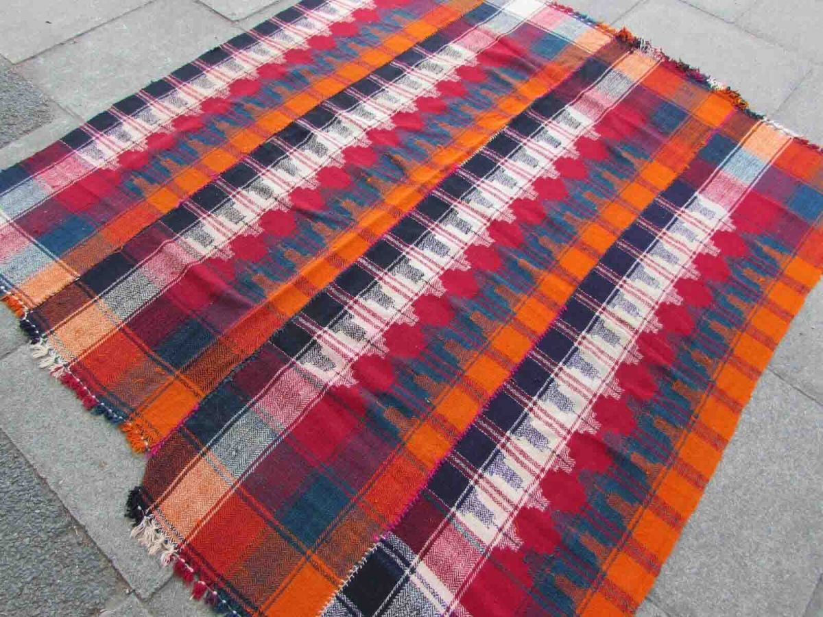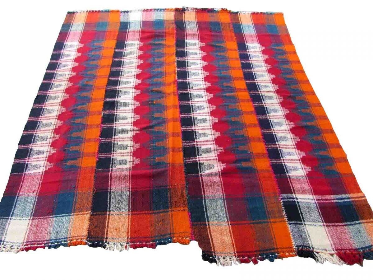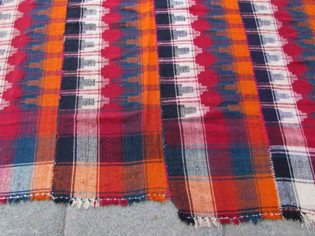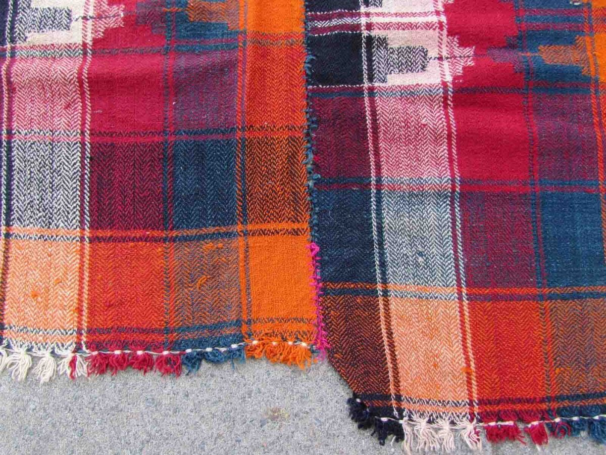 Handmade vintage Persian Moj kilim in colorful shades made in stripes. The Moj is made as a throw, usually made from two or few narrower piece, nearly identical (you able to undo the joint in middle and use it as a curtain) one of the panel is shorter than others. The Moj is crooked and is not perfectly rectangular or evenly straight due to being handmade.