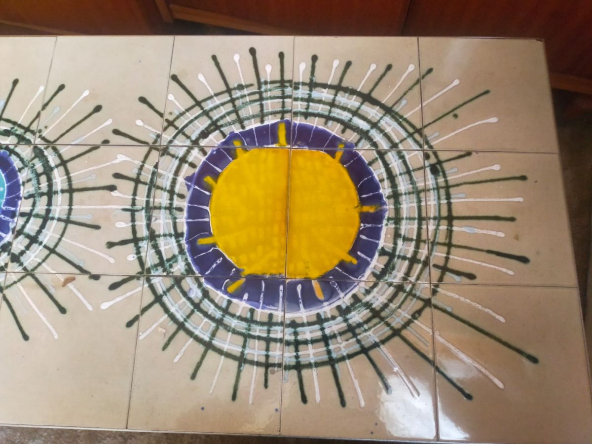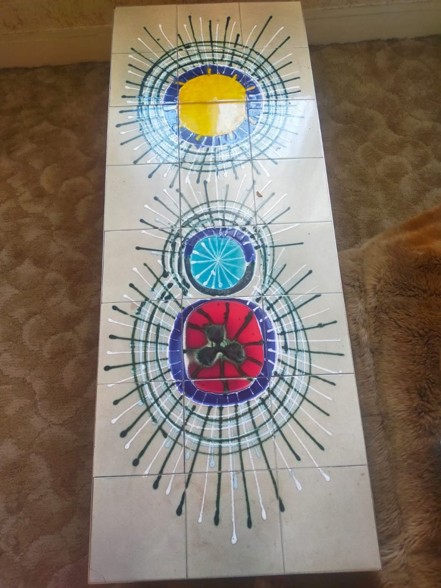 Vends table basse Belarti, modèle Sunburst, années 60/70. plateau en céramique, pieds en chrome et petit plateau intermédiaire avec lecteur de K7 ( pas en état de marche,) Bon état général.