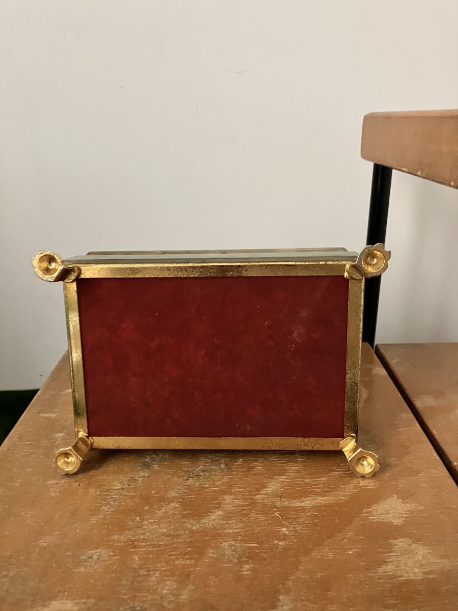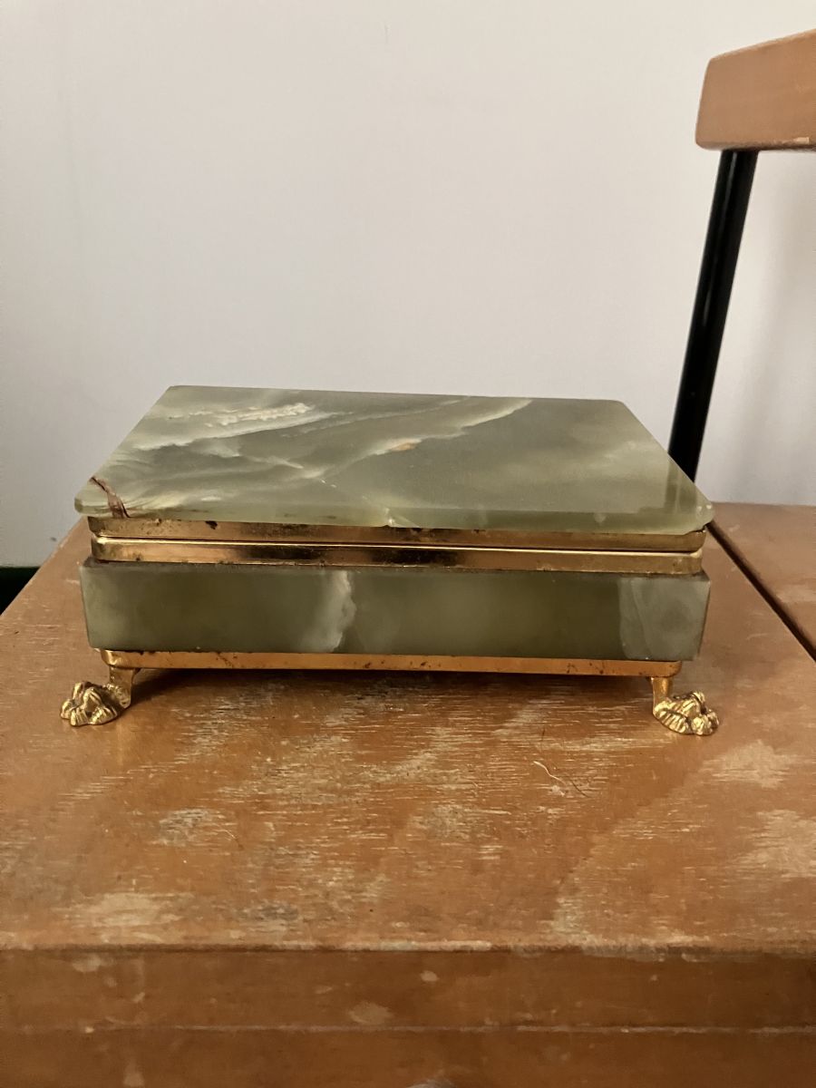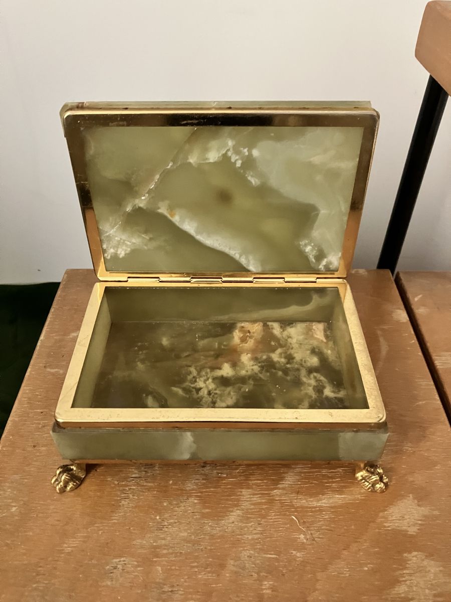 Boite à cigarette ou petite boite de table basse en ONYX vert, pieds de lion dorés, très jolie, dans son jus, un peu abimée dans un coin mais fait son effet !