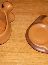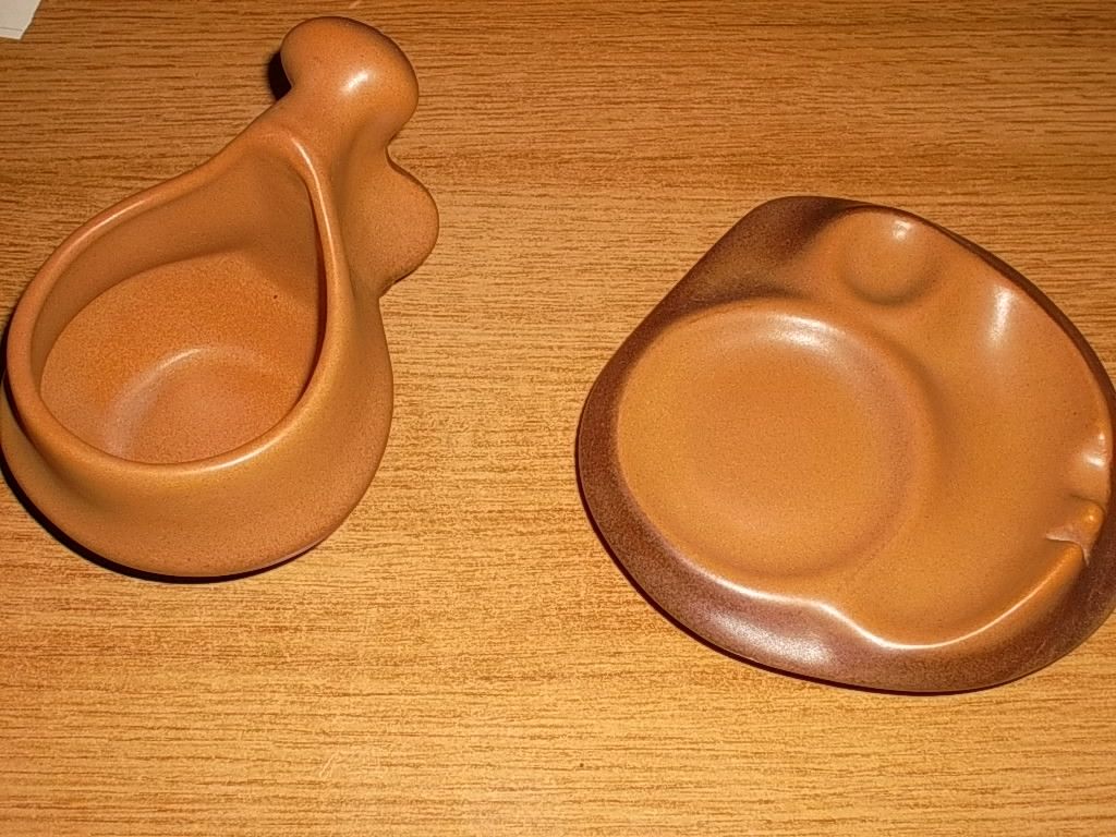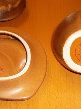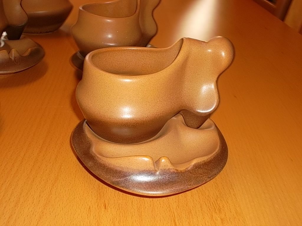 Les soucoupes, également d'aspect inhabituel, comportent un emplacement pour un biscuit avec une encoche repose cuiller, pouvant également faire office de cendrier, avec porte cigarette.