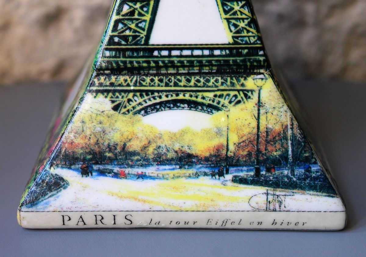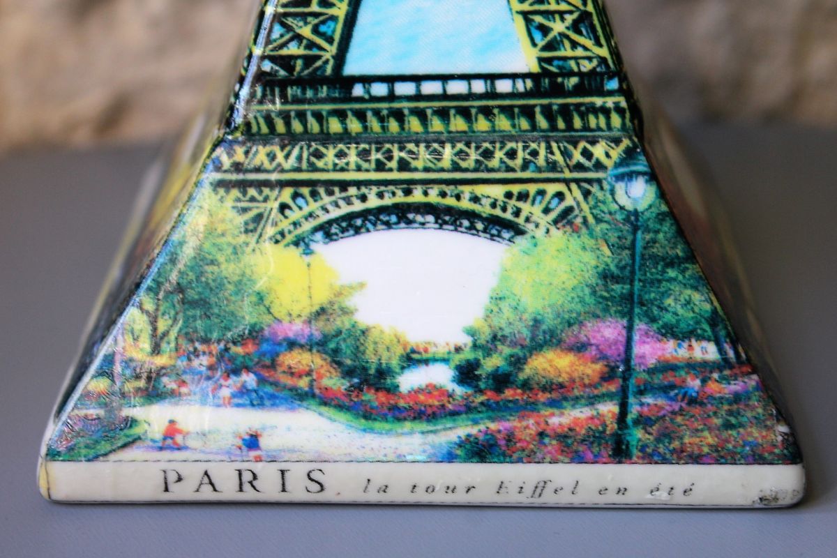 Rare et recherchée : tirelire ancienne en céramique, représentant la Tour Eiffel aux quatre saisons, une par face. Le soin apporté à la reproduction des motifs et des détails est impressionnant (voir photos). Qui plus est, elle est signée sur la face hiver (signature non reconnue). C’est un superbe souvenir vintage de Paris, en excellent état d’usage, d’un tout autre niveau de qualité que les productions actuelles.