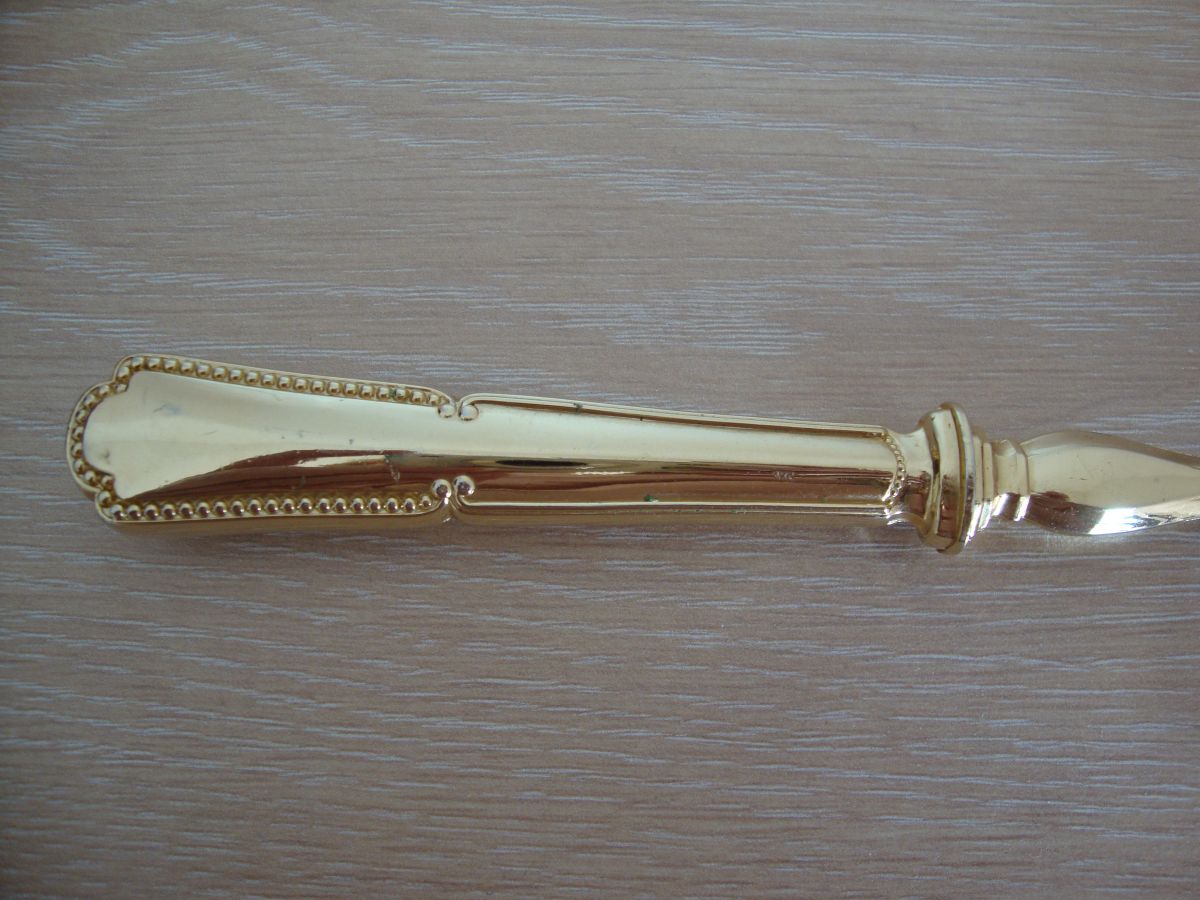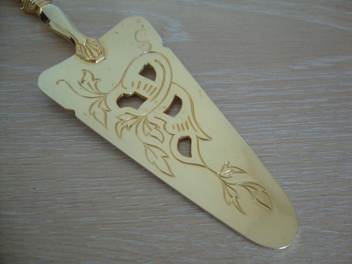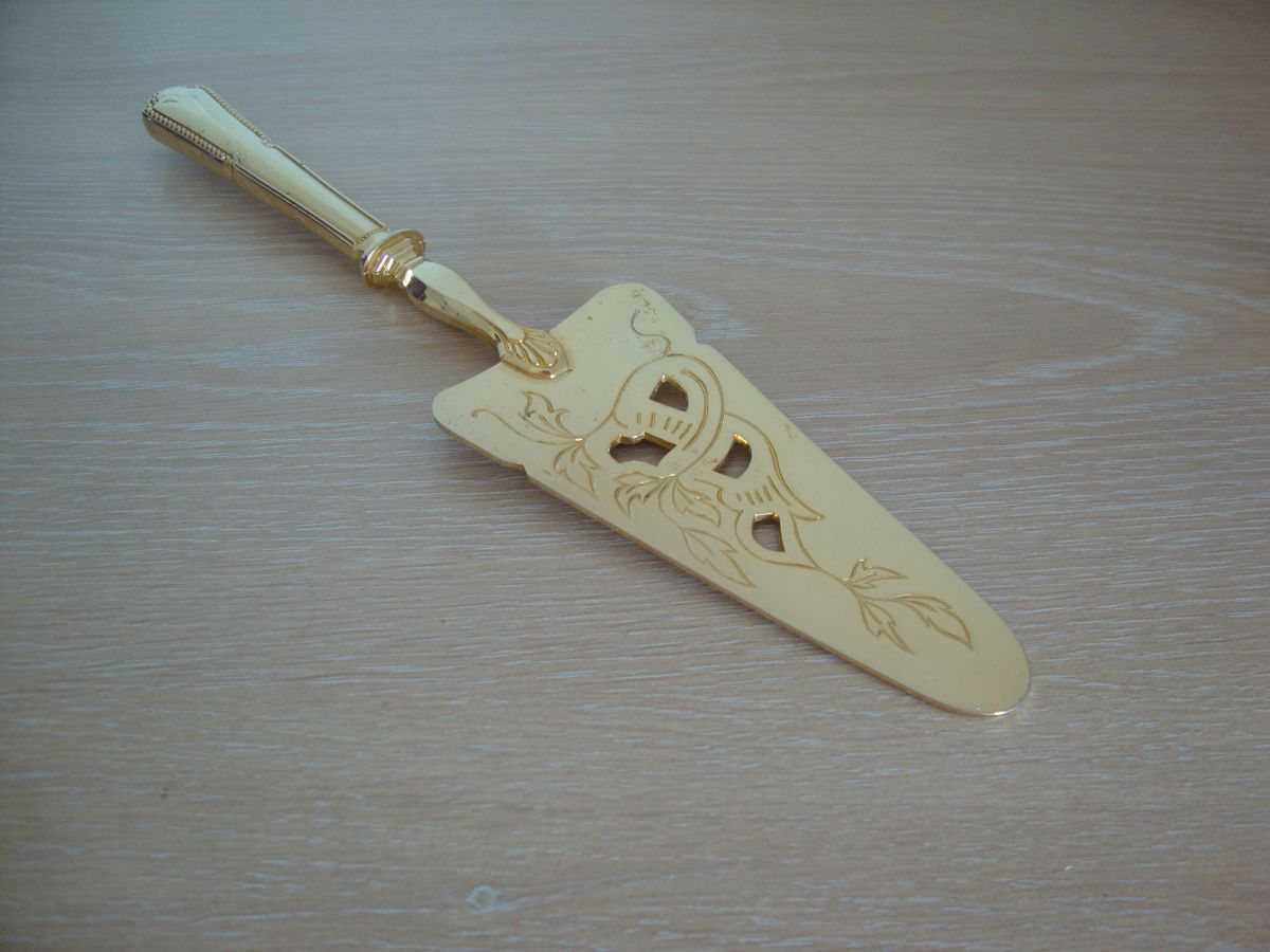 Pelle à tarte ancienne en métal doré ajouré et ciselé, manche perlé, marque privilège. Bon état général.