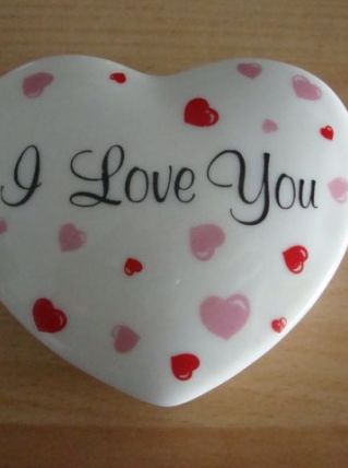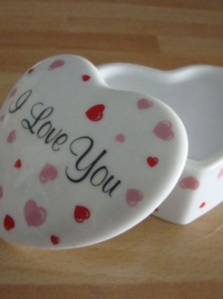 Boite à bijoux en céramique , forme coeur et ornée de coeurs, portant l'inscription " I love you "