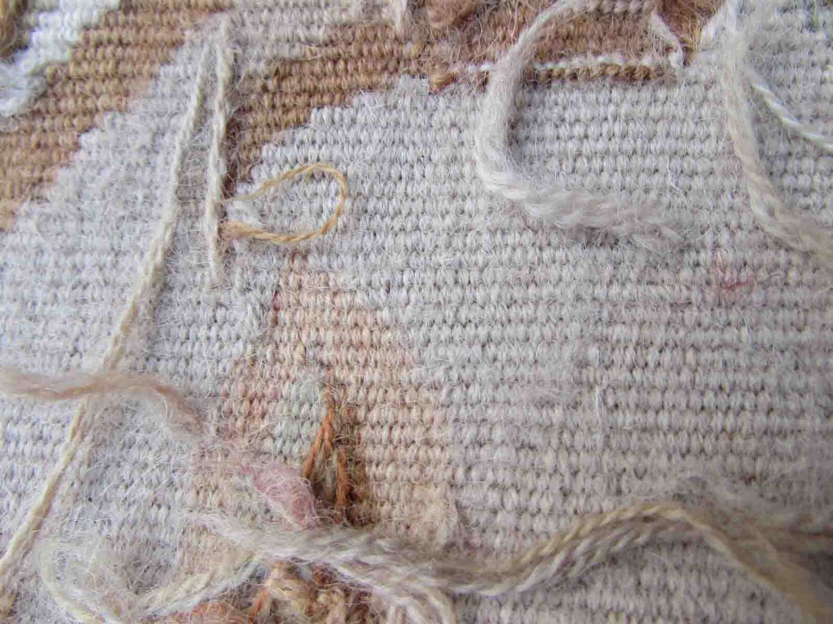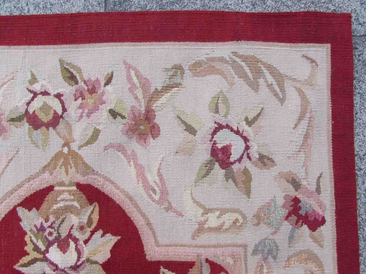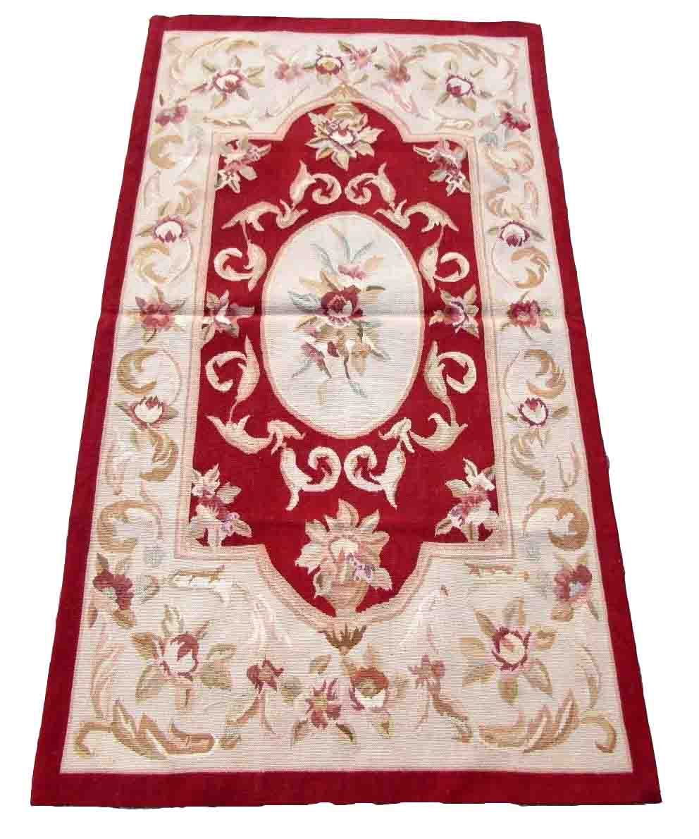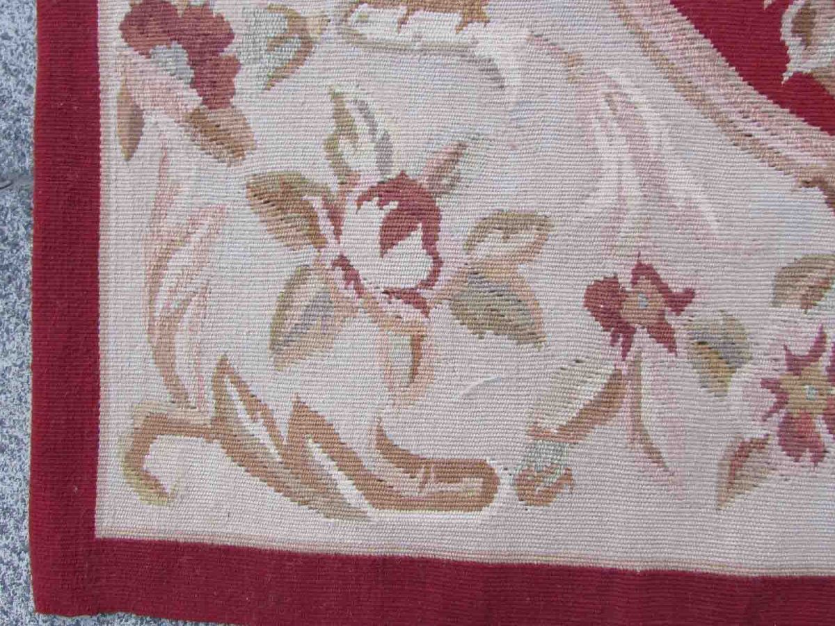 Handmade vintage French Aubusson rug in traditional design and in red and beige colors. The rug is from the end of 20th century in original good condition.