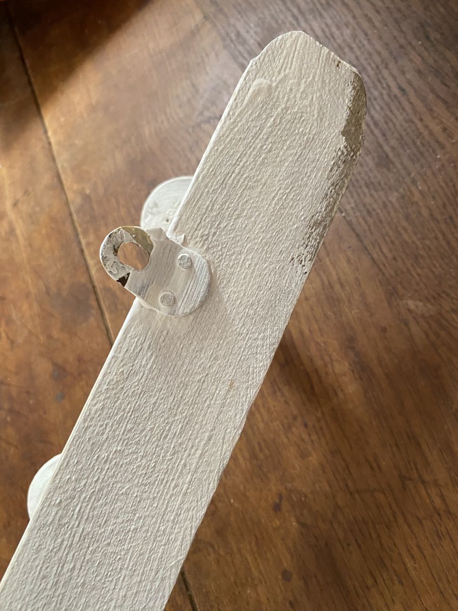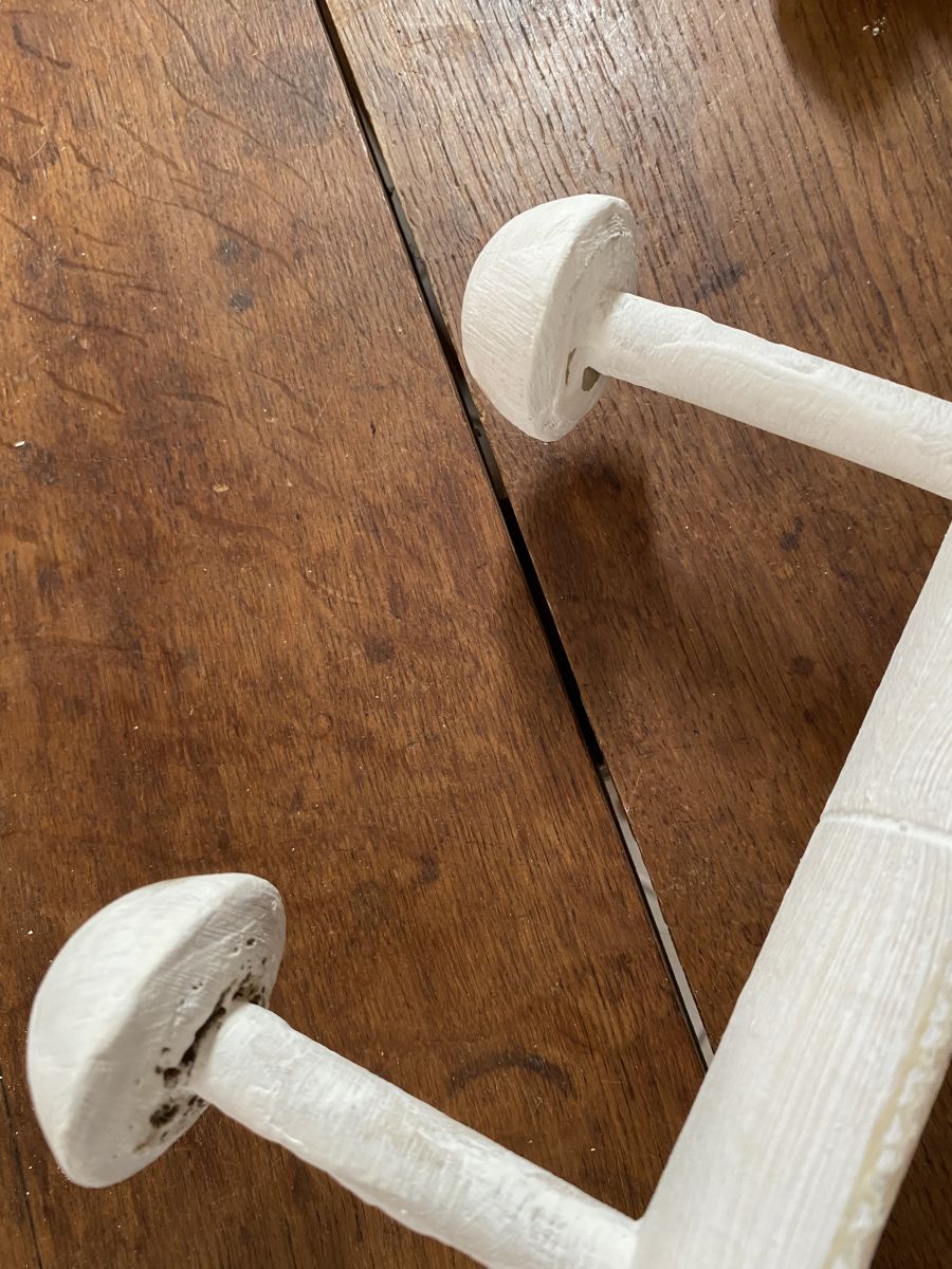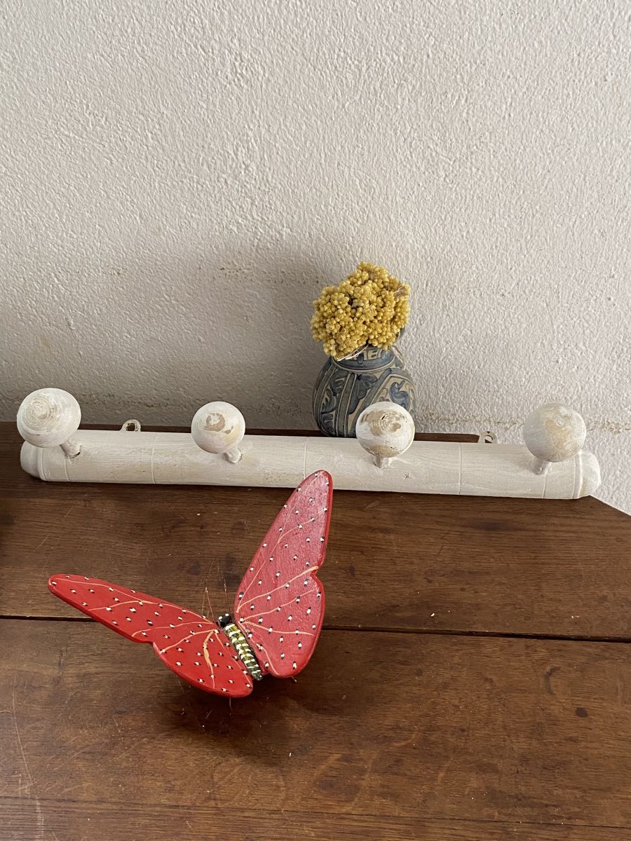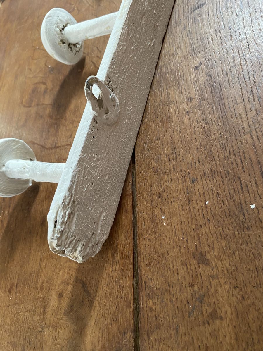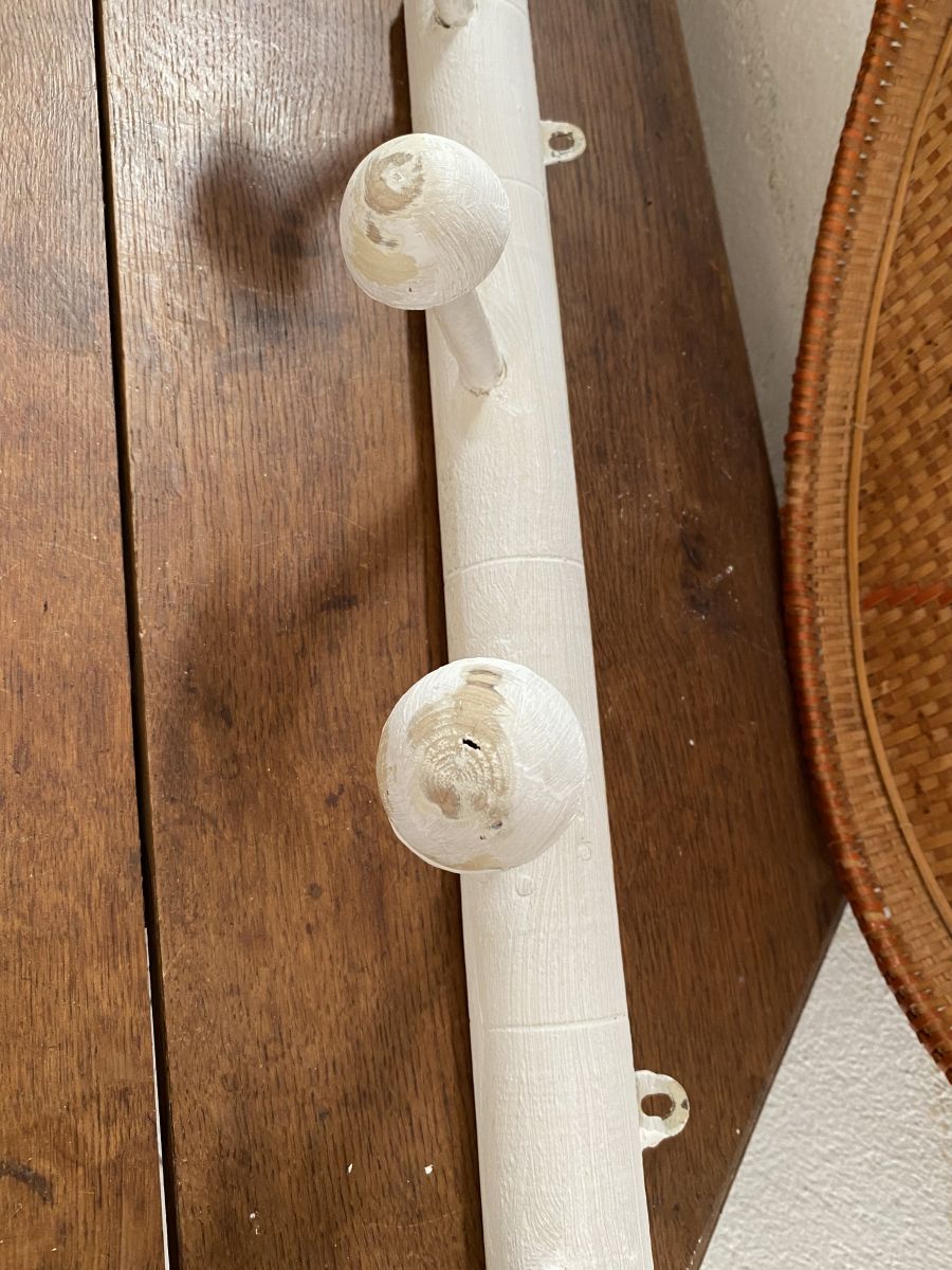 Portemanteau mural en bois datant des années 40.Authentique dans sa patine blanche, solide à 4 boules.Traces du temps sur une extrémité non visibles lorsque le portemanteau est fixé au mur.