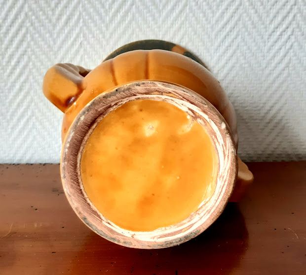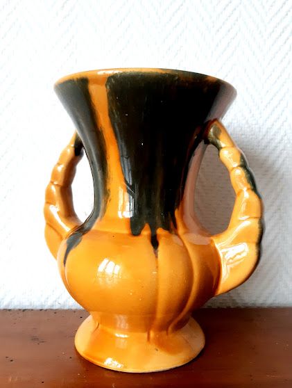 Vase à col large et double anses, en céramique émaillée jaune à décor de coulures vertes.