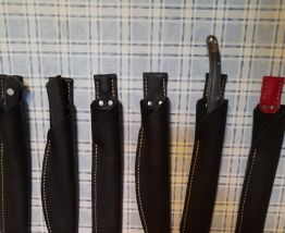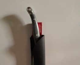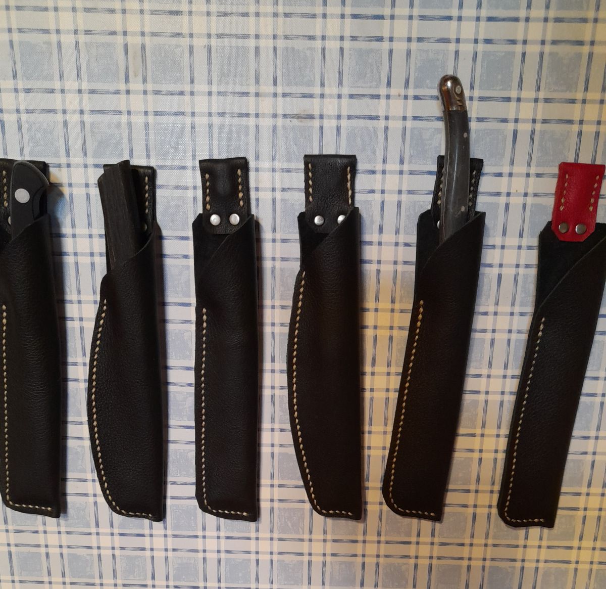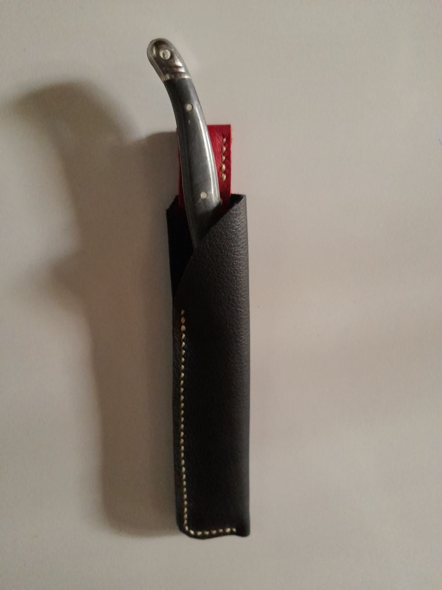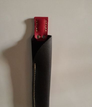 Un étui porte couteau aimanté en cuir à positionner par exemple sur le frigo