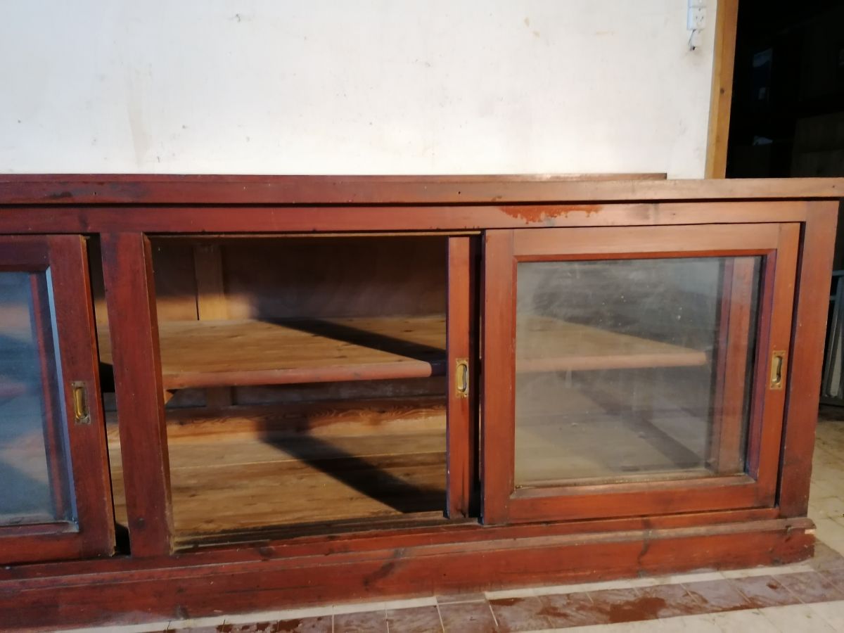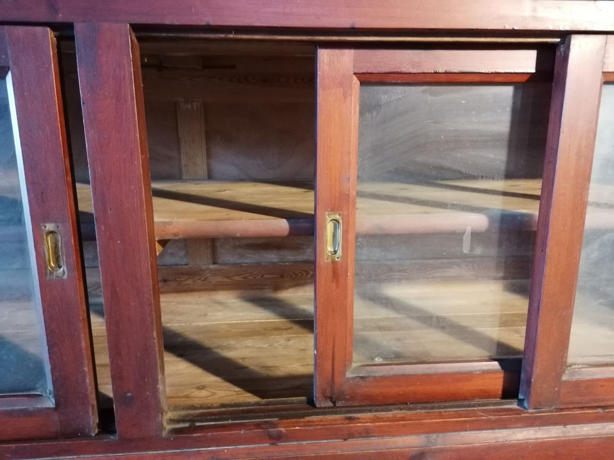 2 Meubles avec 6 portes en verre coulissantes dont l'un avec des étagères au dos pouvant donc servir de séparation dans une pièce et l'autre avec un fond derrière. Le dernier est en mauvais état constitué uniquement du montant et des étagères intérieures d'origines. Nous avons retrouvé les 6 portes coulissantes..