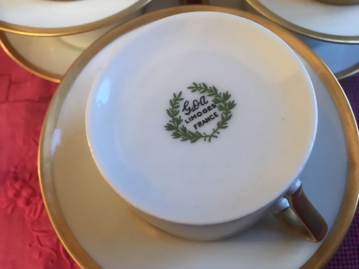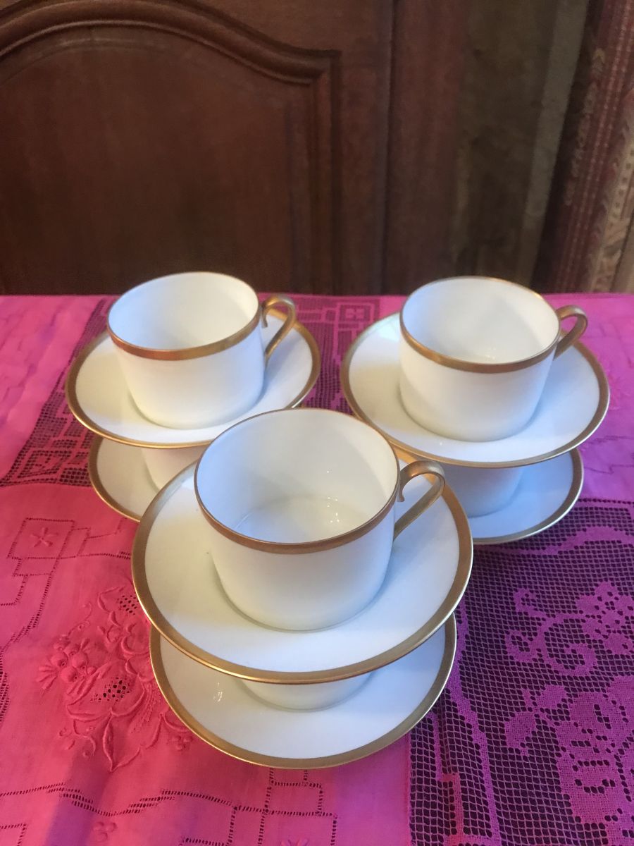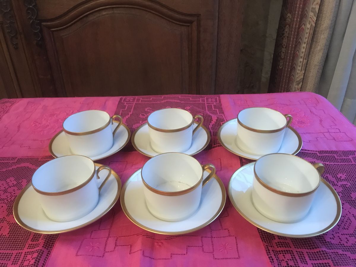 6 tasses à thé et soucoupes en porcelaine blanche GDA Limoges France, liseré doré.