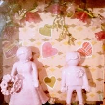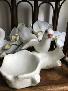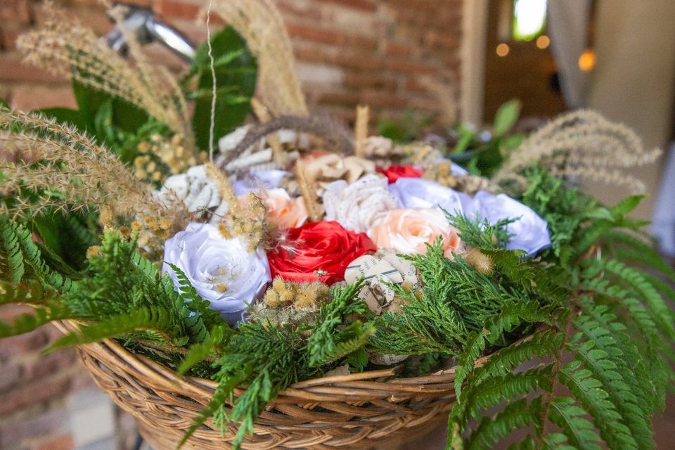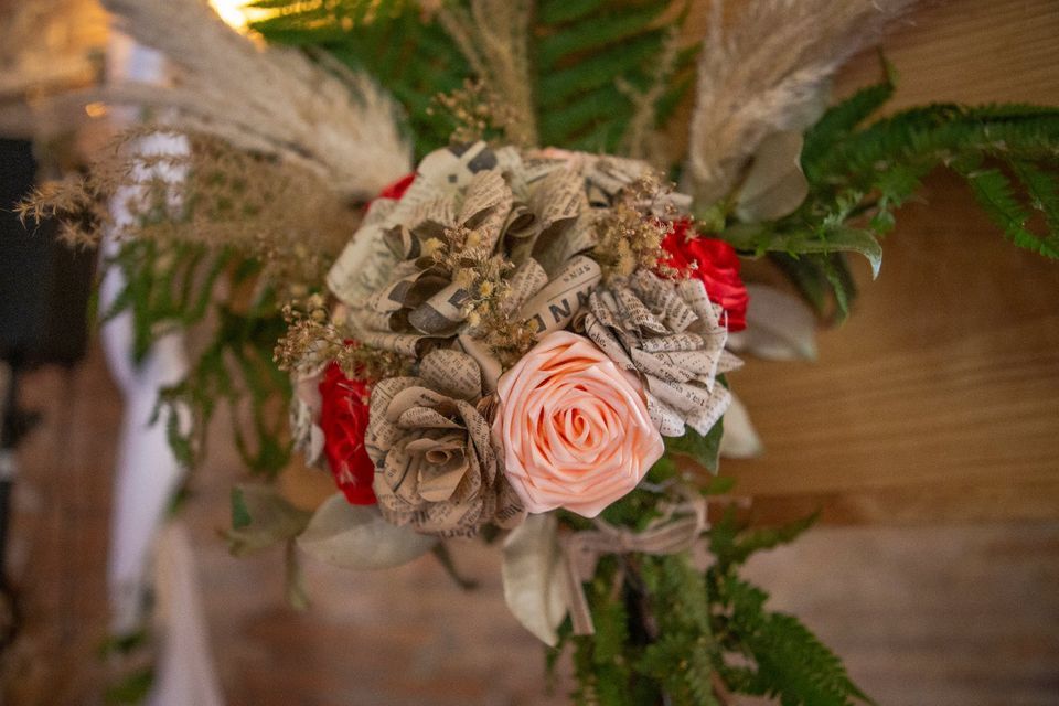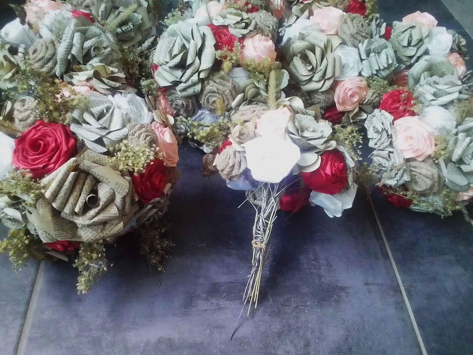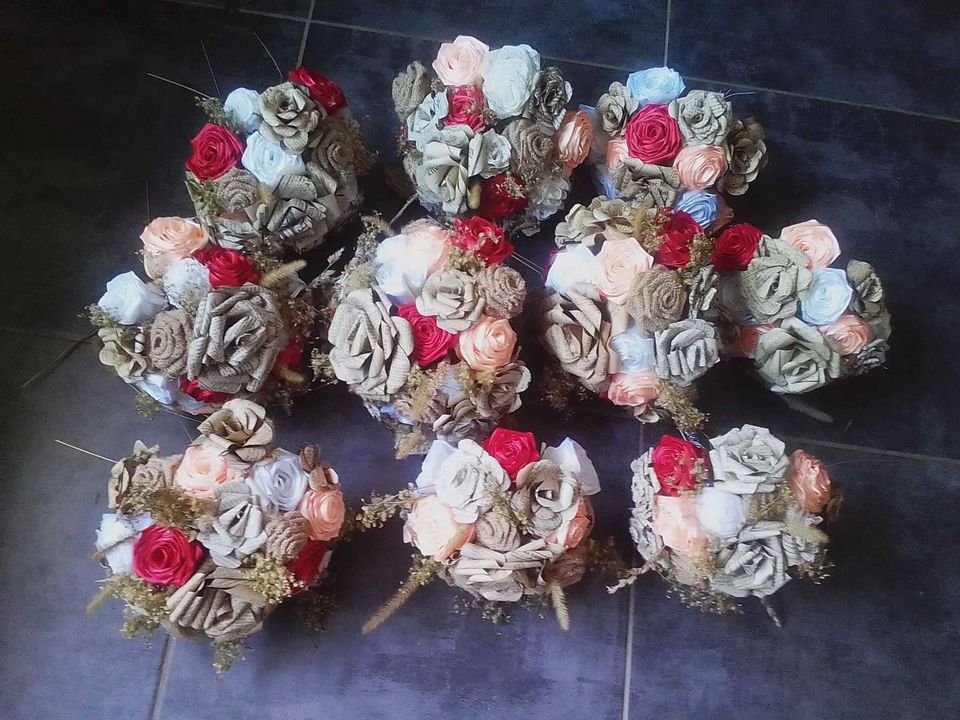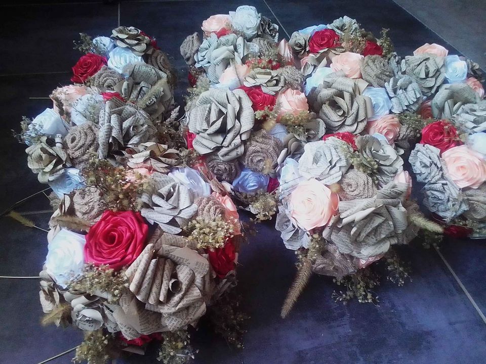 Composés de fausses fleurs en papier journal d'époque années 20, ruban de satin rouge, saumon ou blanc, ruban de dentelle, toile de jute
