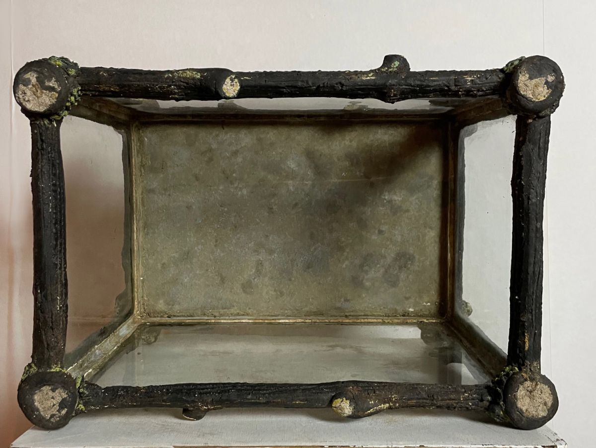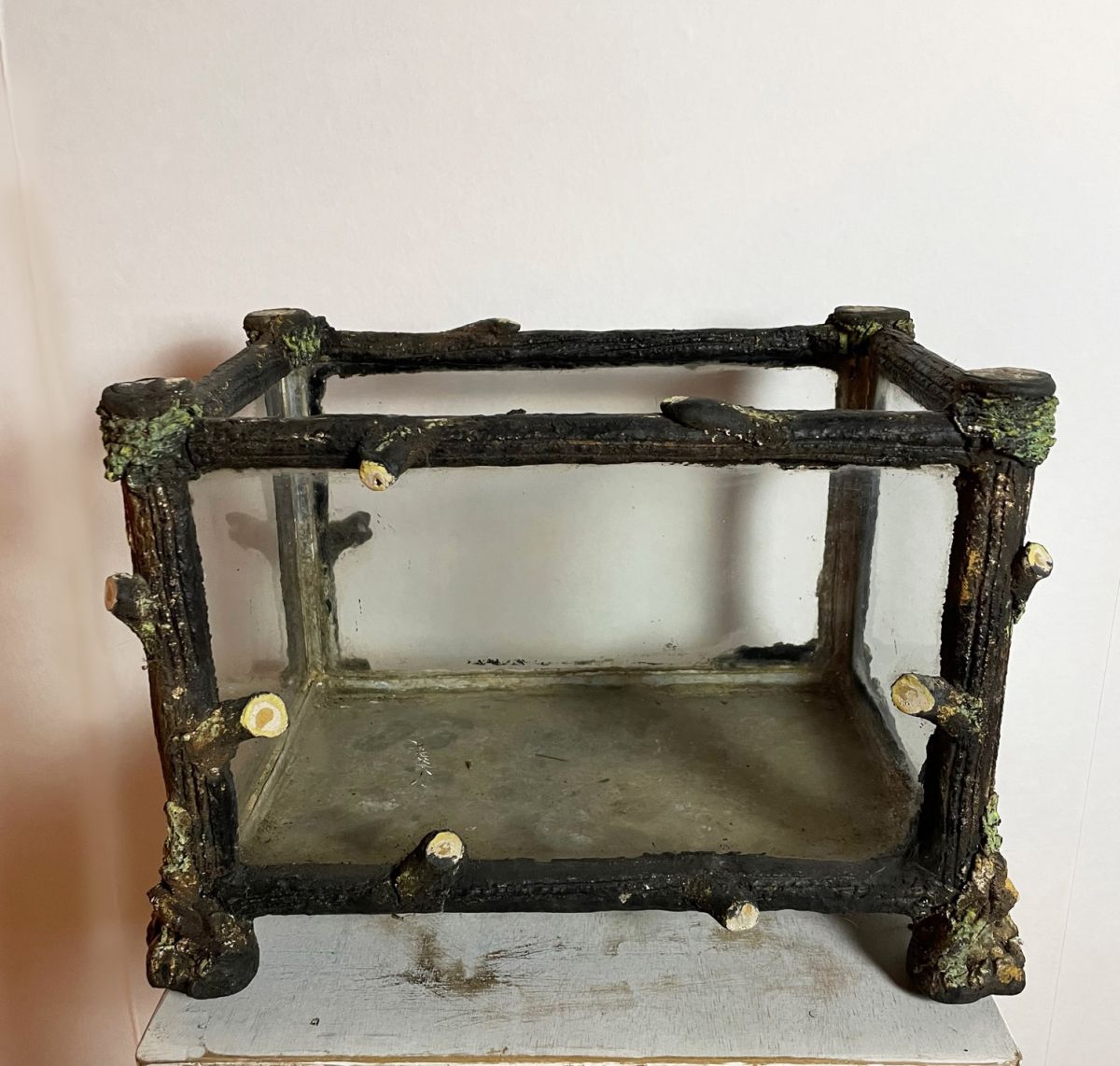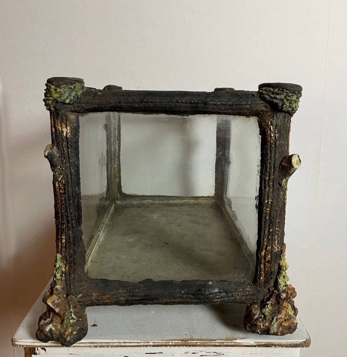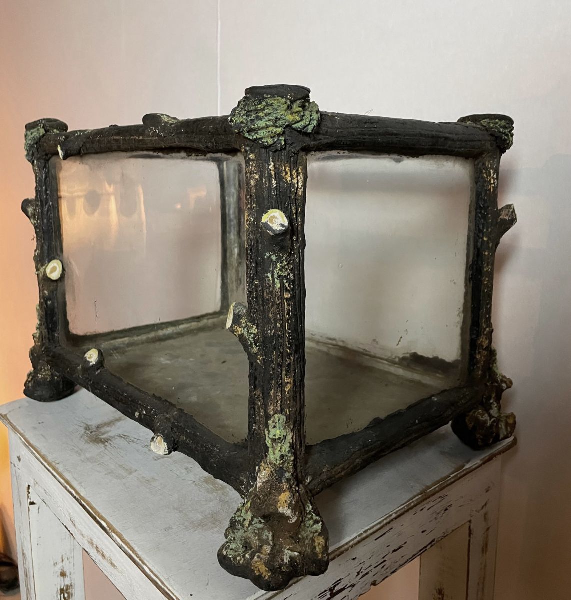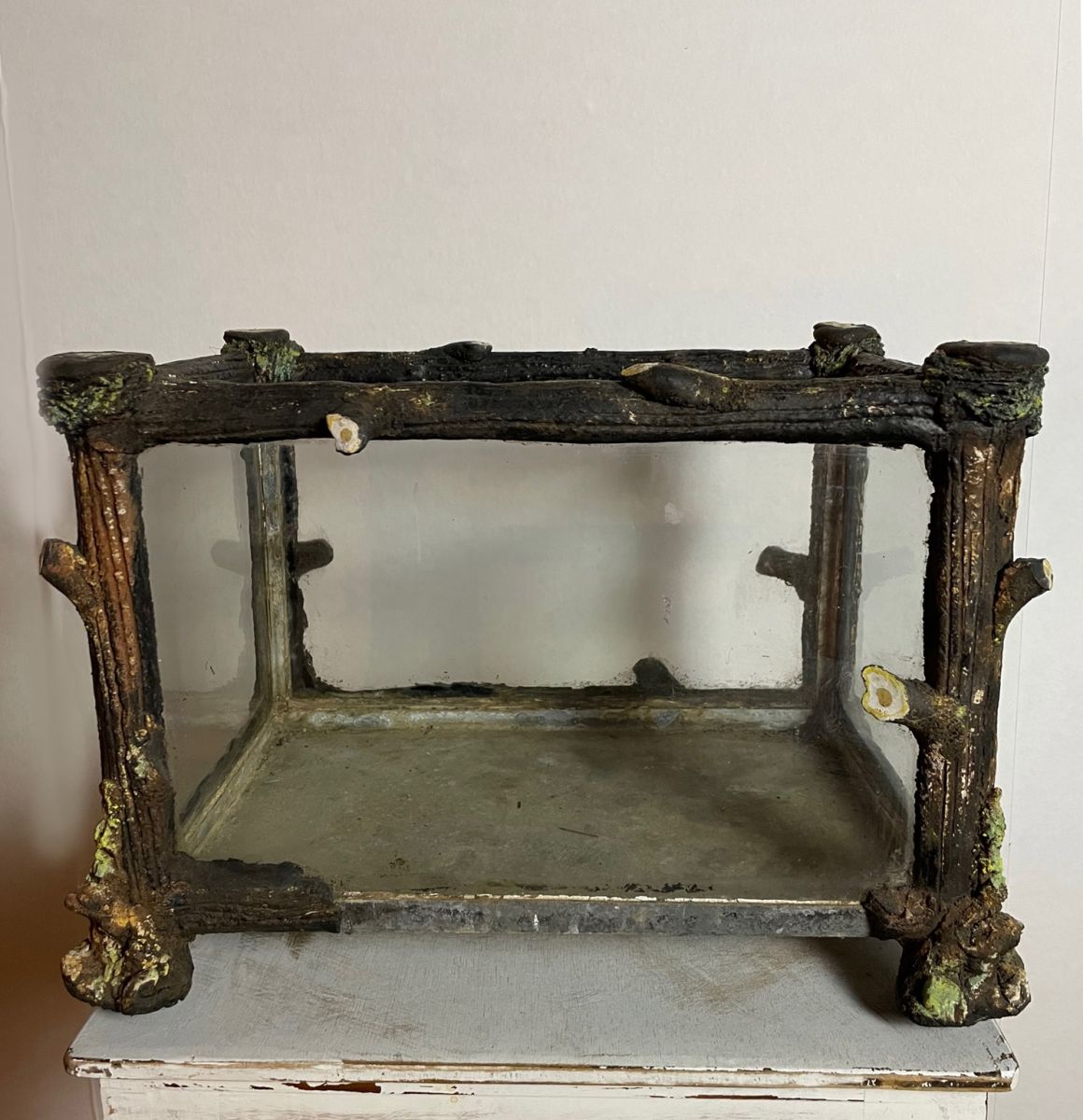 Aquarium en ciment faux bois et fond en zinc. Il peut servir de centre de table, vitrine, vase pour des fleurs séchées etc. L'étanchéité n'est pas garantie. Quelques traces sur le verre, un éclat en étoile qui ne compromet pas la tenue du côté en verre concerné. Il manque une partie d'habillage ciment faux bois sur une partie basse. Hauteur 27 x L37 x P27
