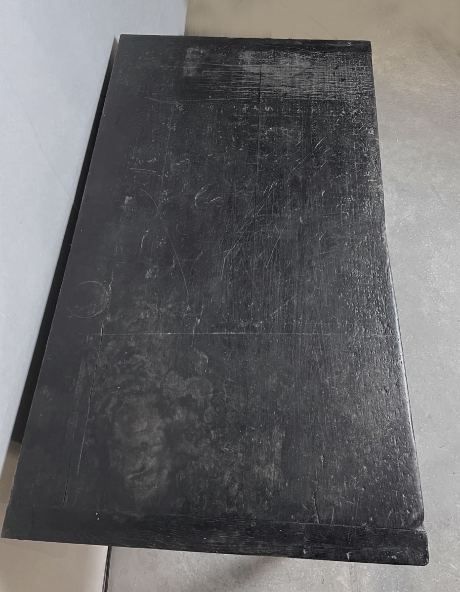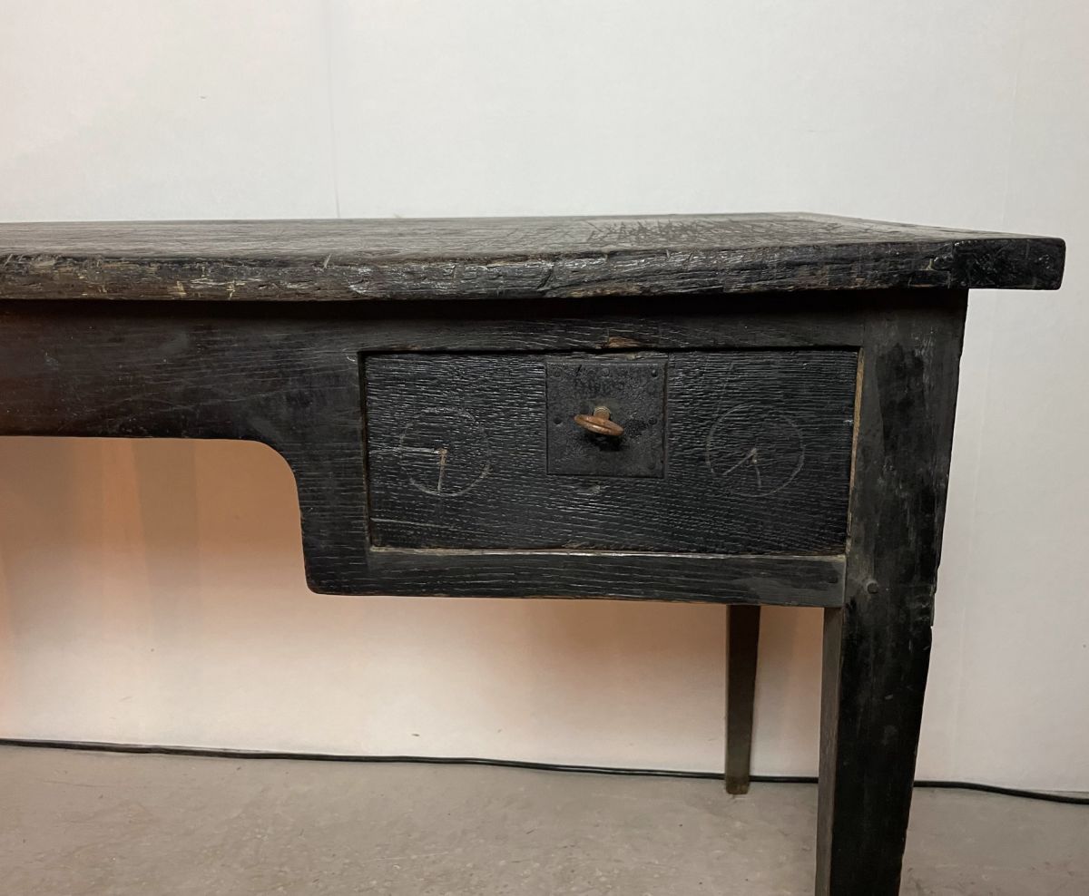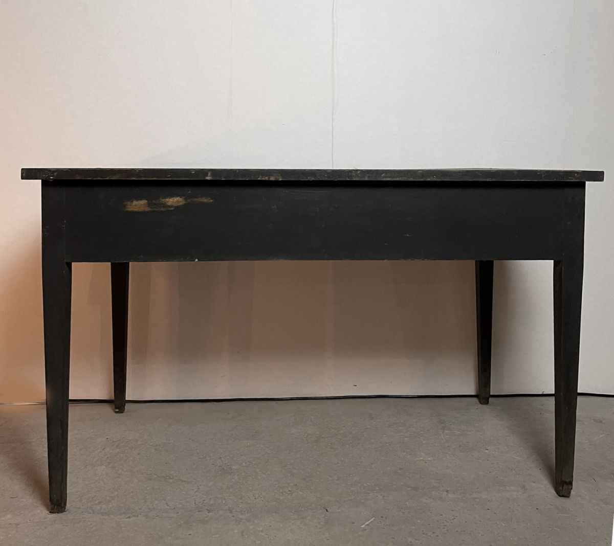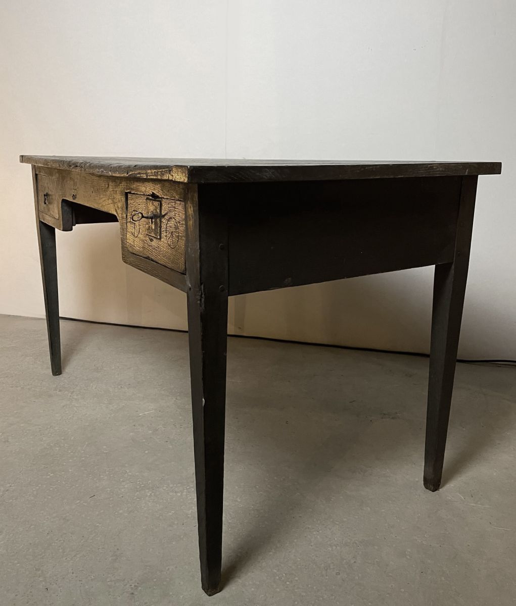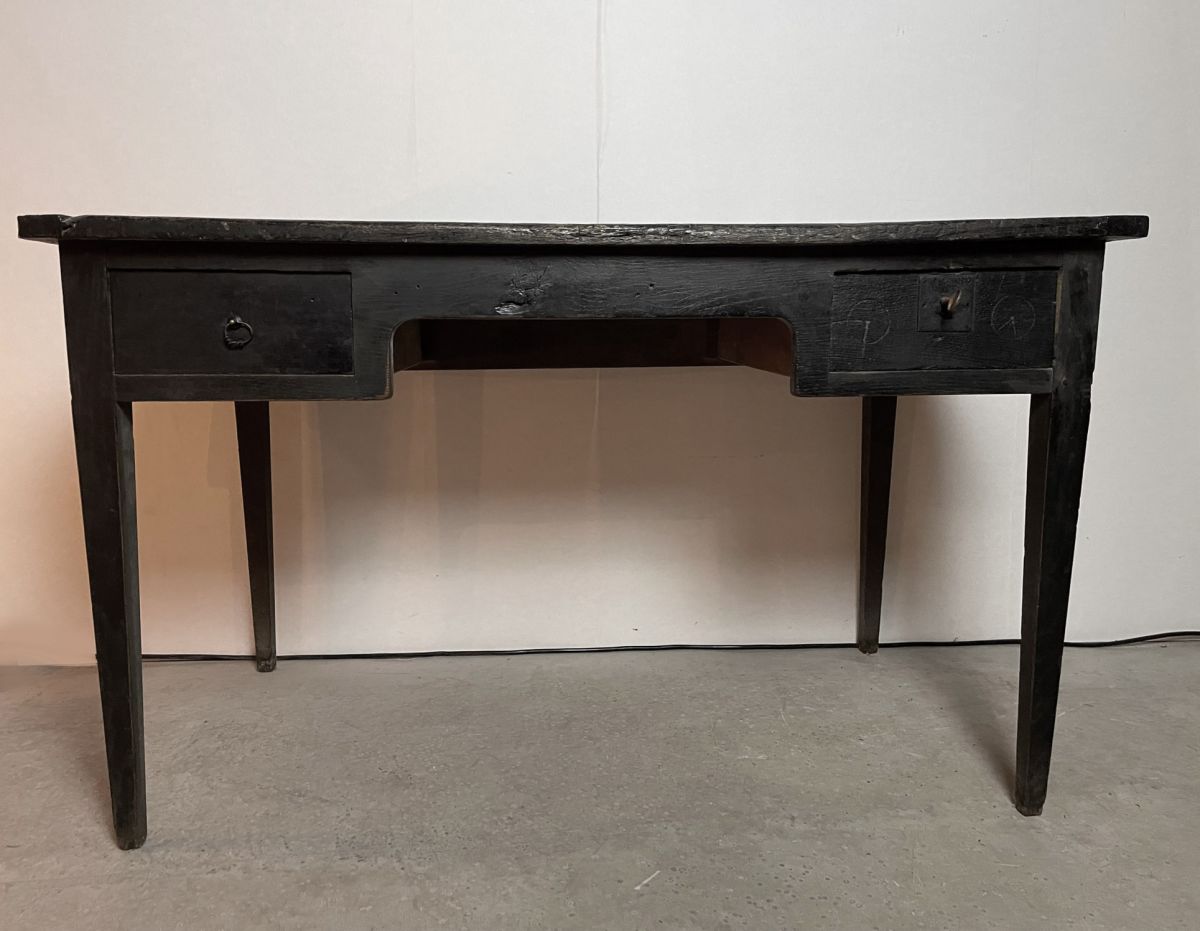 Bureau deux tiroirs en bois peint. Hauteur 70 cm, passage des jambes correct : 61 cm. Largeur 117, profondeur 65. Un tiroir comporte un anneau, l'autre se tire avec une clé qui ne permet plus de condamner le tiroir. Nombreuses traces sur le dessus, rayures. Belle patine si on aime ce vécu.