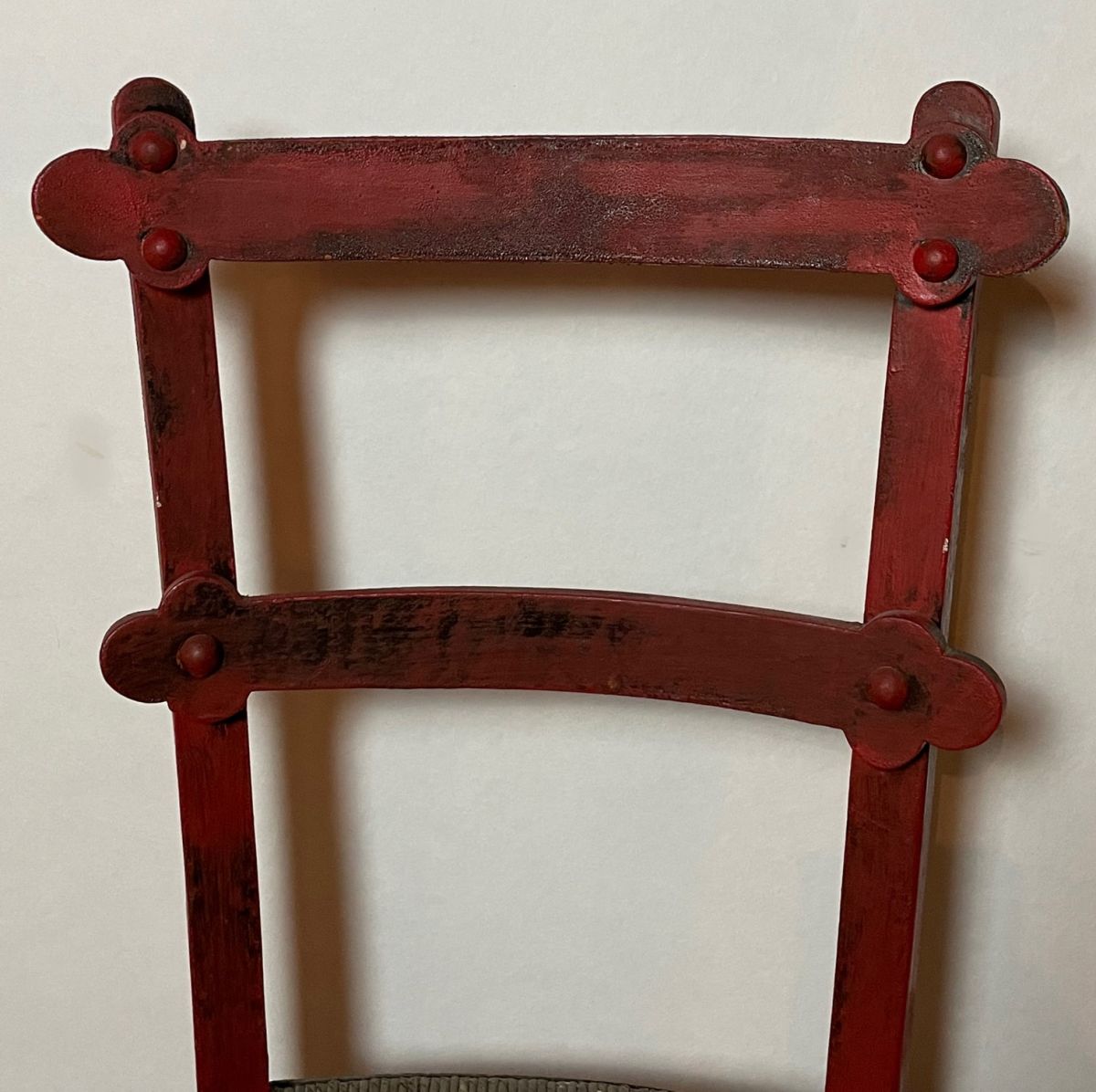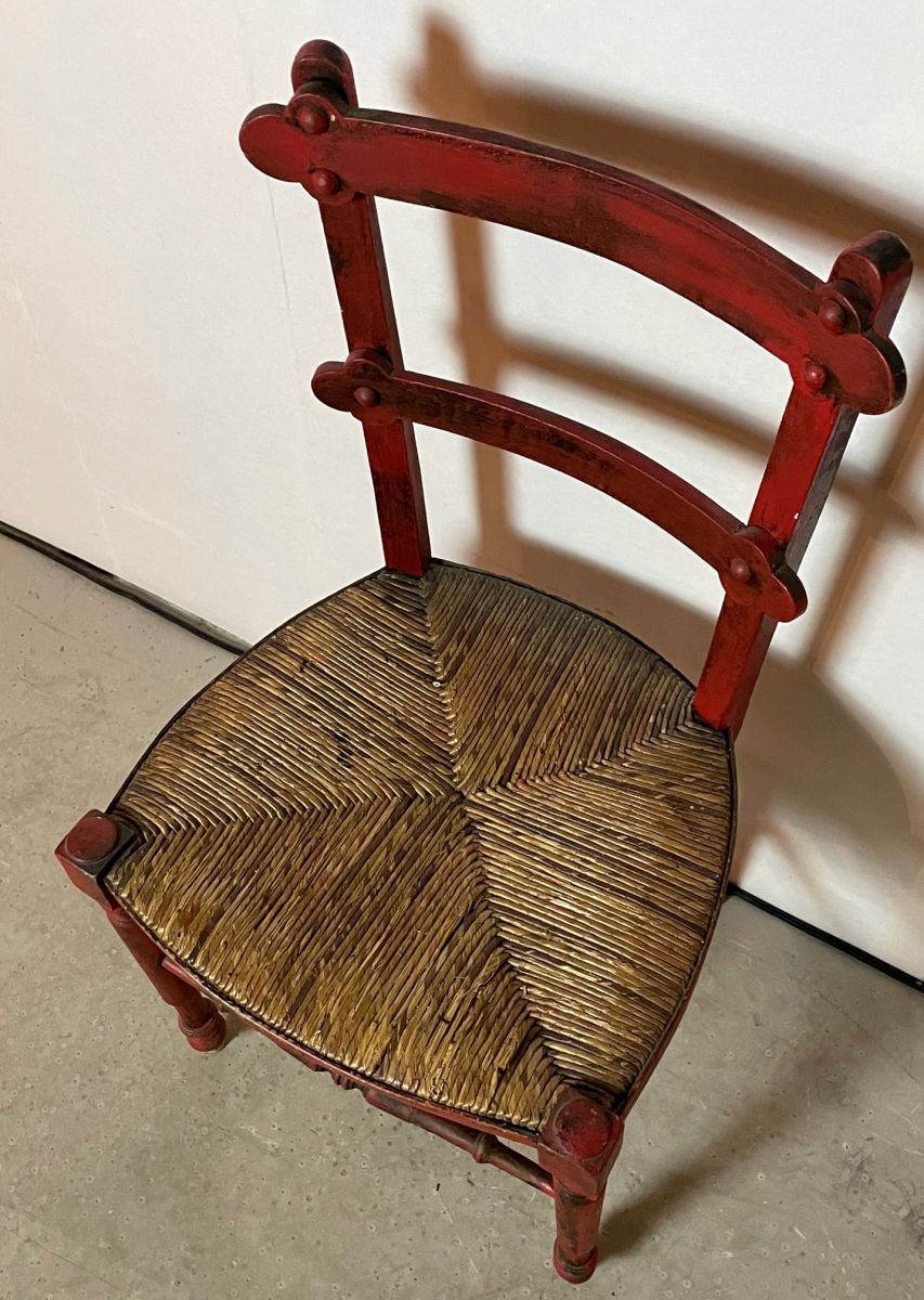 Chaise campagnarde rouge patiné en bon état. Paillage très correct, pieds avant joliment travaillés, éléments du dossier en forme de trèfle. Hauteur d'assise 44 cm.