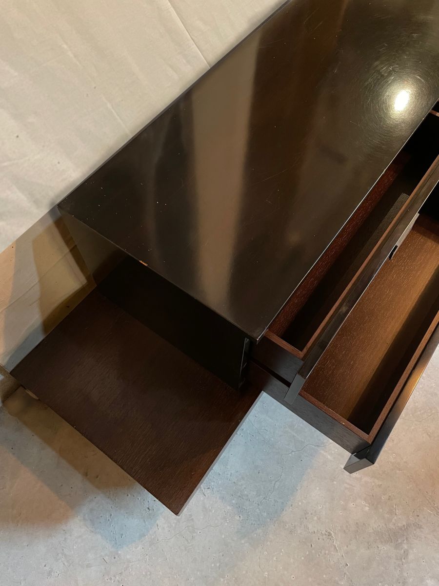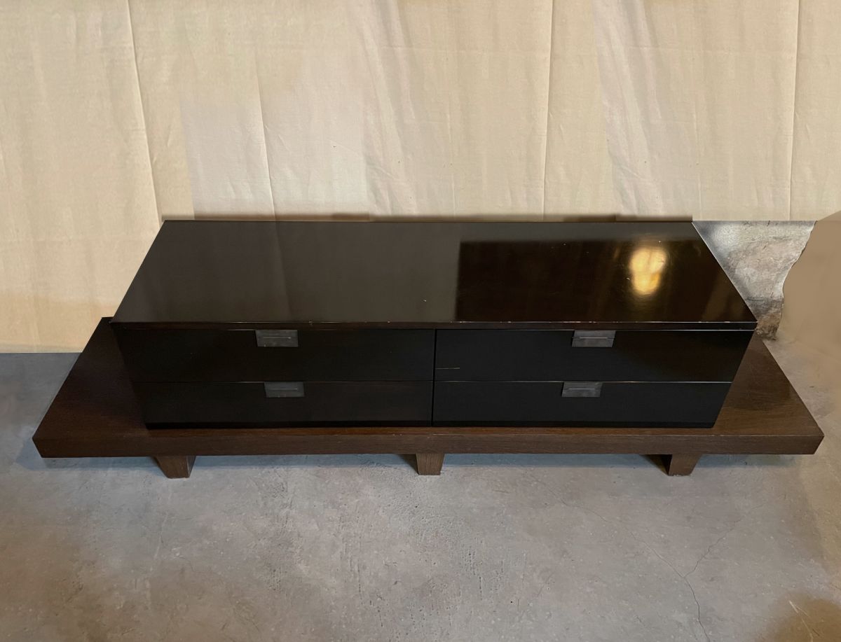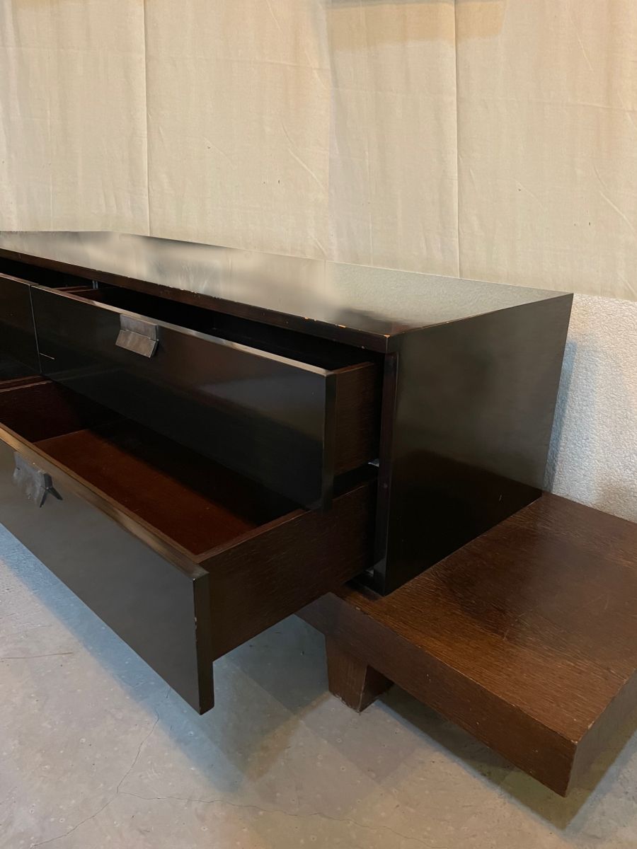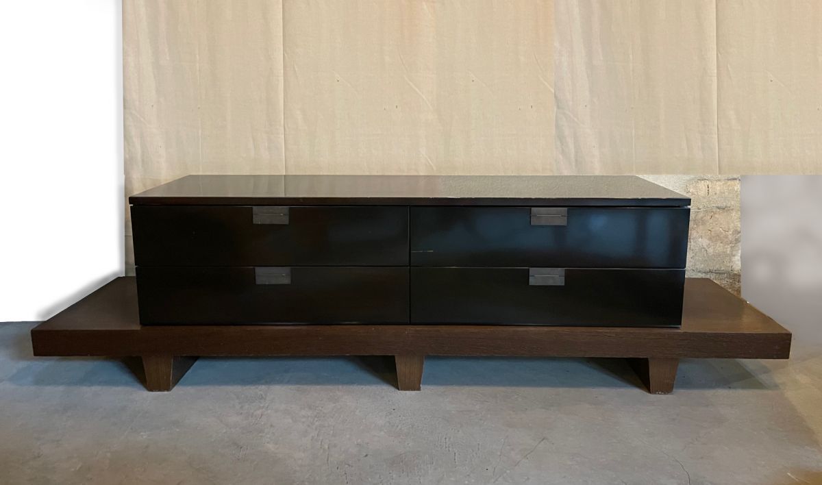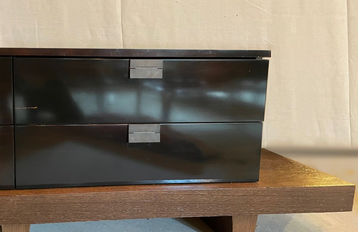Console basse (hauteur 59 cm) dans un esprit japonisant de Christian Liaigre réalisée dans les années 80. Christian Liaigre designer et décorateur a été réputé pour l'aspect intemporel et pur de ses meubles. Elle est d'un seul morceau. D'une largeur hors tout 2m17 et d'une profondeur de 54 cm, le bloc tiroirs mesure 157 sur 38 cm. Tiroirs sur coulisses en parfait état de fonctionnement. Il y a de petits éclats sur le vernis une marque ronde légèrement plus foncée sur le bout droit du support, une marque horizontale sur un tiroir. La partie en laque est couleur bois très foncée, presque noire selon les angles de vue.