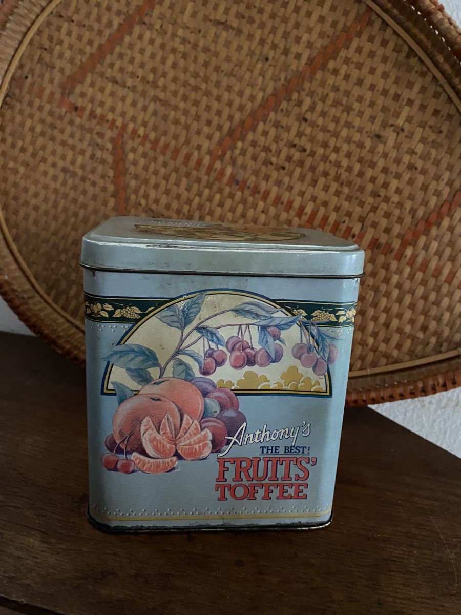 Boîte anglaise en métal, au décor de fruits.Marquée Anthony’s the best fruits’ toffee.Date des années 70.Traces d usage sur l extérieur, intérieur impeccable.
