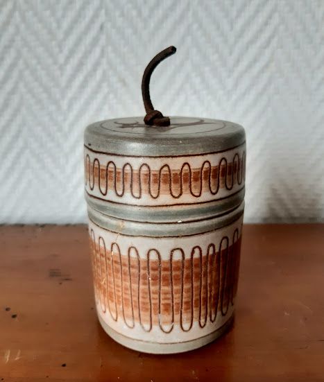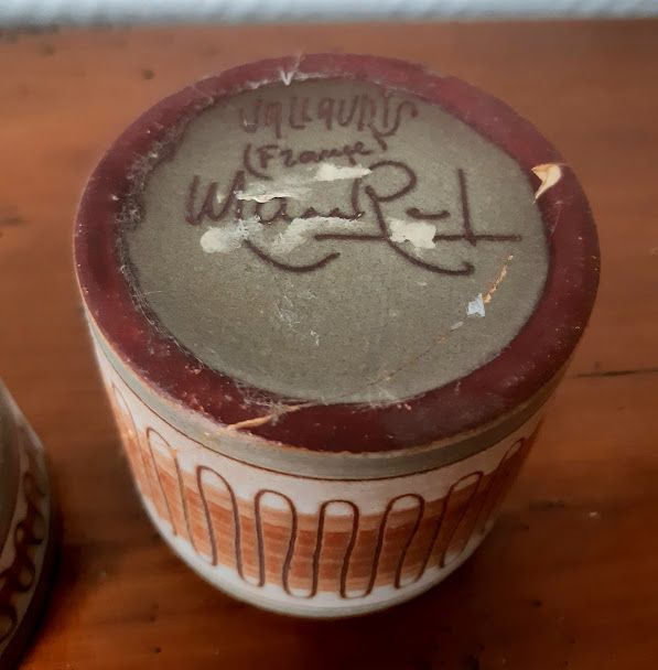 Une boîte couvert par le céramiste René Maurel (1910-1986) à Vallauris. Boîte à décor africaniste dans les tons orangés. traces de restaurations, 9 x 6,5 cm