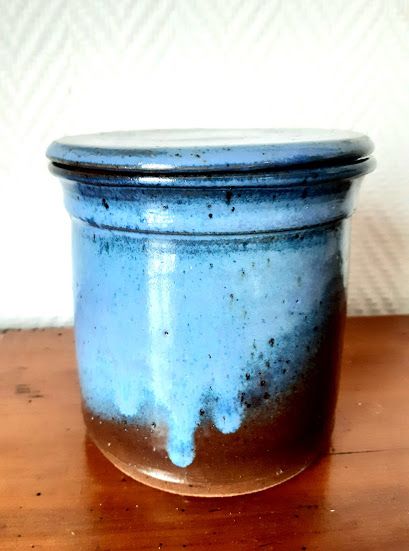 Accompagnée d'un plus grand pot couvet en céramique en dégradé de bleu, signé au revers RD. en très bon état, 12 x 11,5 cm