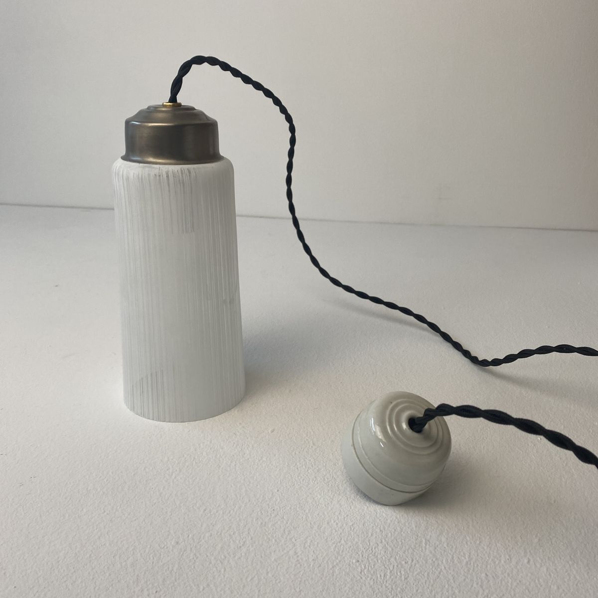 L’électricité a été refaite. Douille à vis petit culot (Ampoules E14). Branchement par domino. Fil noir en tissu tressé et rosace de fixation en porcelaine.