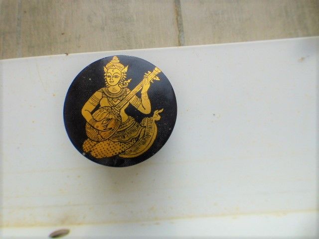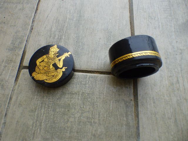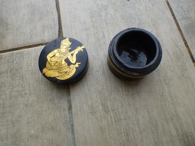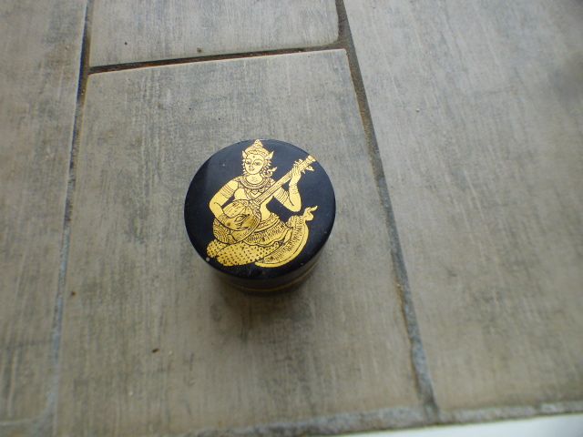 boite pilulier ou pour petits bijoux, en laque motif asiatique "joueuse de Cithare" doré.